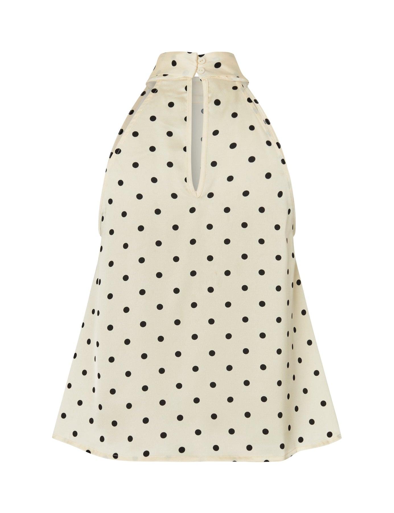Hihaton toppi MbyM:ltä, kermanvärinen mustilla pilkuilla. Topissa on väljä istuvuus ja solmittavat yksityiskohdat pääntiellä.