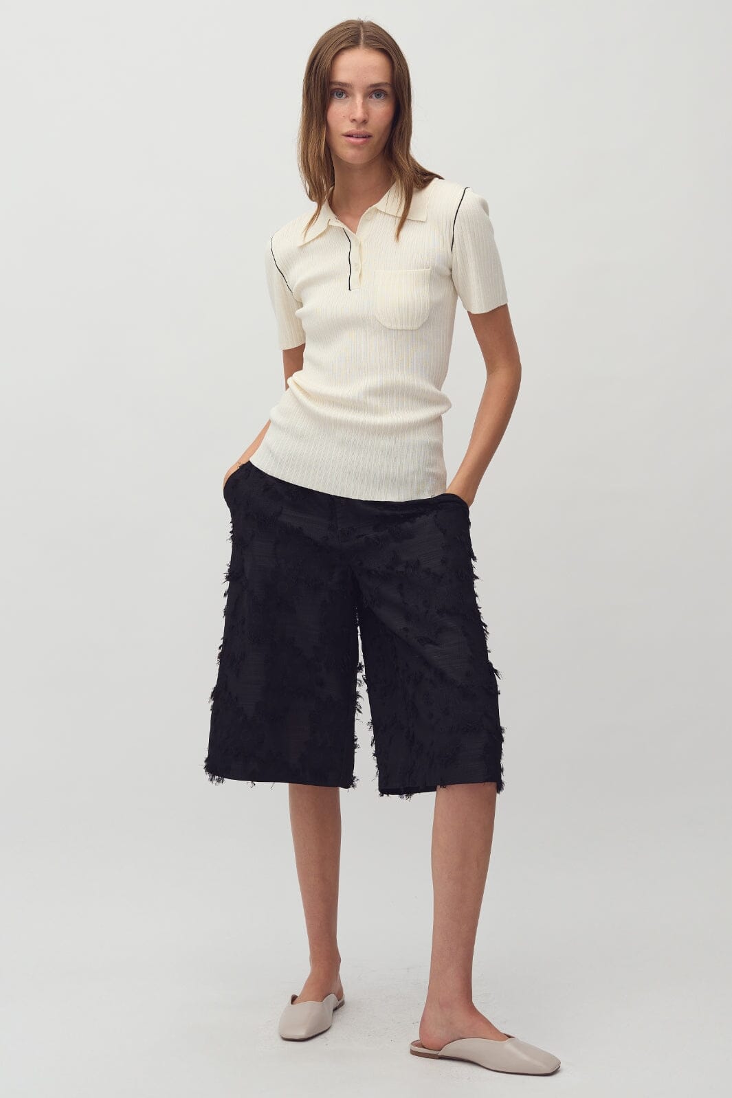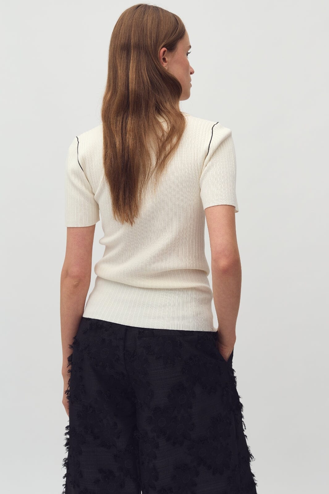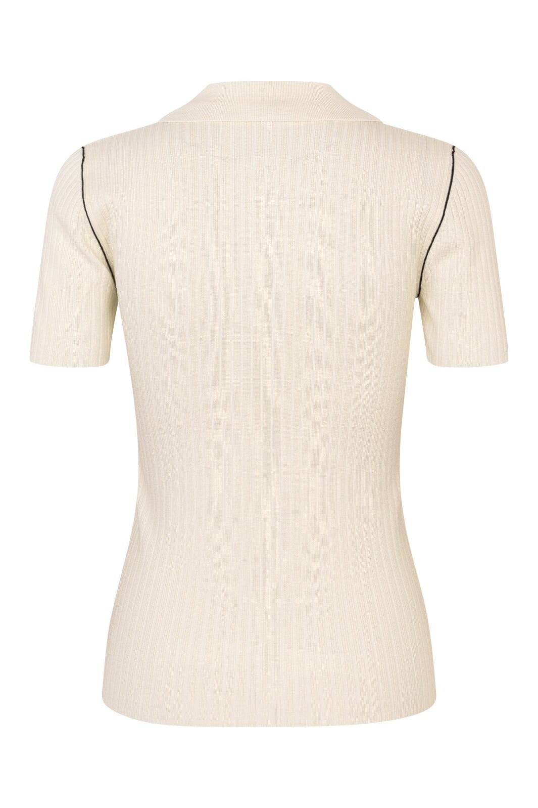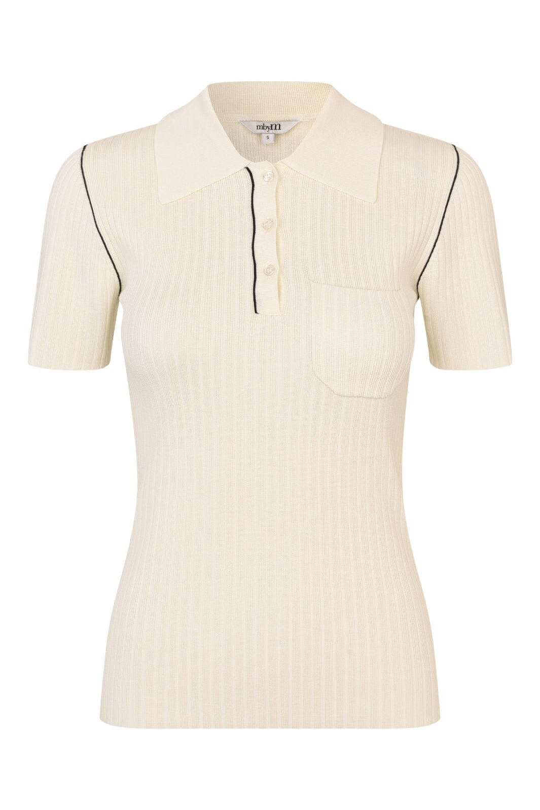 Kreeminvärinen polo-paita MbyM:ltä, jossa on ribbitekstuuri. Musta kontrastitikkaus olkapäiden ja rintataskun kohdalla antaa paidalle yksinkertaisen ja tunnistettavan ilmeen.