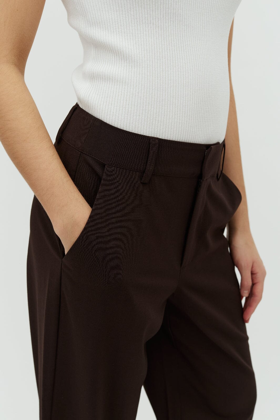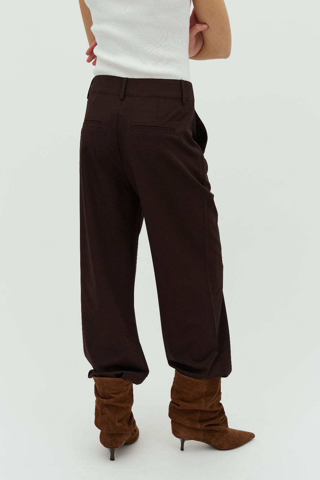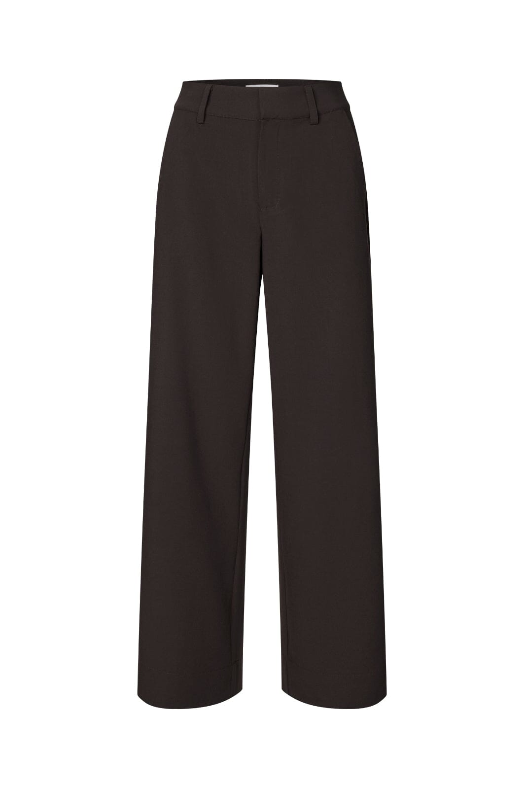 Tummanruskeat MbyM-housut, joissa on suorat lahkeet, vyölenkit ja sivutaskut. Housuissa on väljä istuvuus ja lattiaan ulottuva pituus.