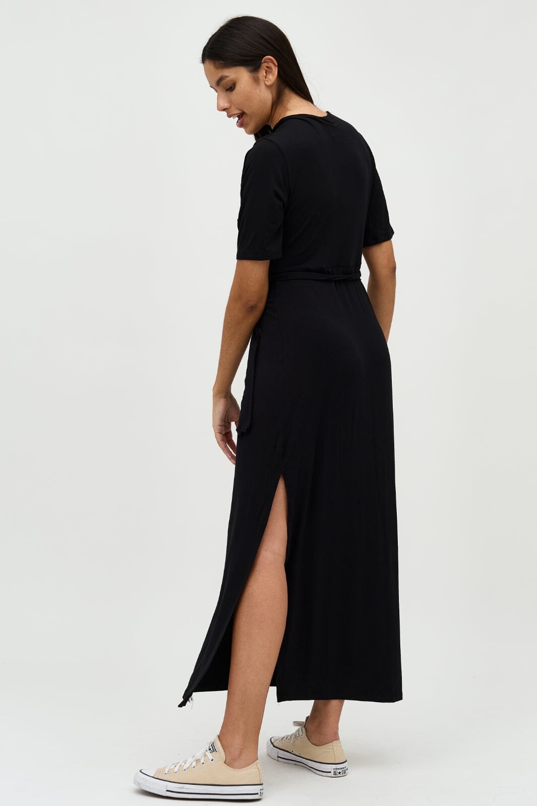 MbyM:n musta nilkkapituinen mekko, jossa on V-pääntie ja lyhyet hihat. Mekossa on vyötäröllä solmittava nauha ja sivussa halkio. Se on valmistettu pehmeästä ja mukavasta materiaaliseoksesta.