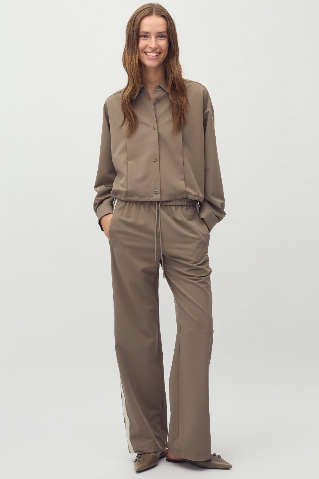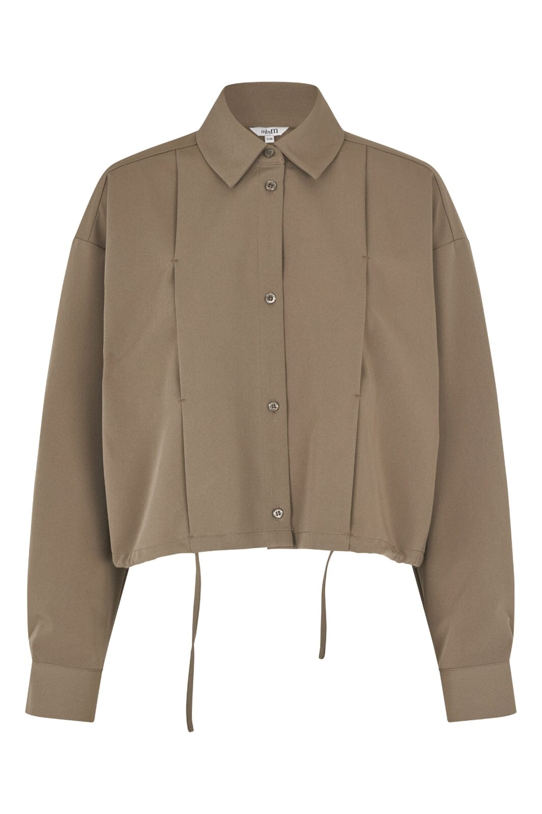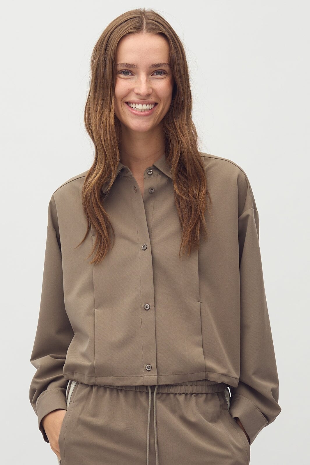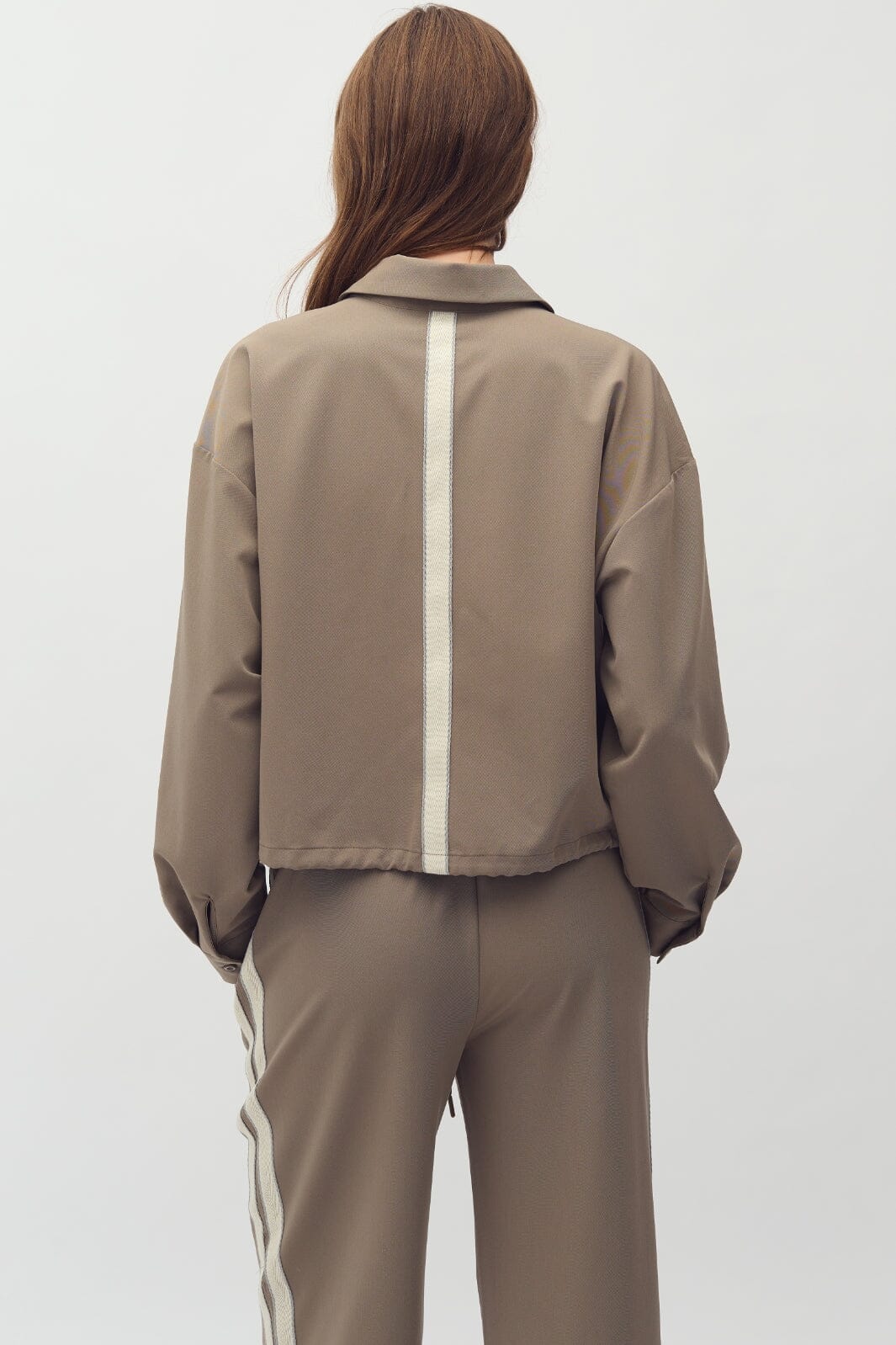 Paidasta MbyM brindle sand -värissä, jossa on kauluspaita ja pitkät hihat. Siinä on nappilukitus edessä ja pystysuora raita selässä, joka luo kontrastia perusvärille.