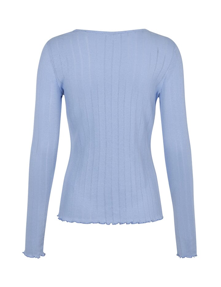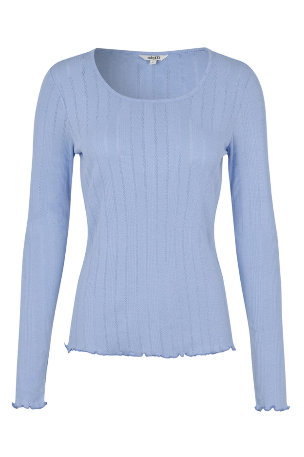 Vaaleansininen toppi MbyM:ltä ribbikankaasta. Topissa on pitkät hihat, pyöreä kaula-aukko ja aaltoilevat reunat hihoissa ja helmassa.