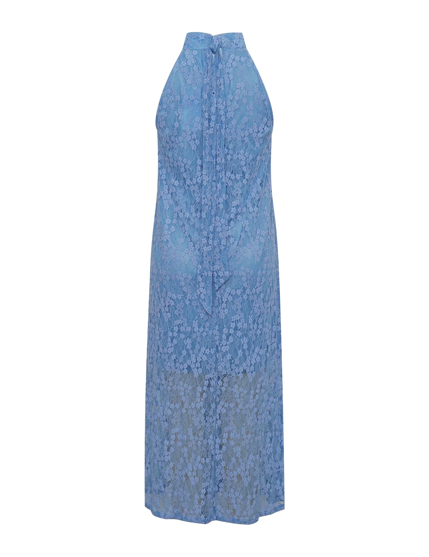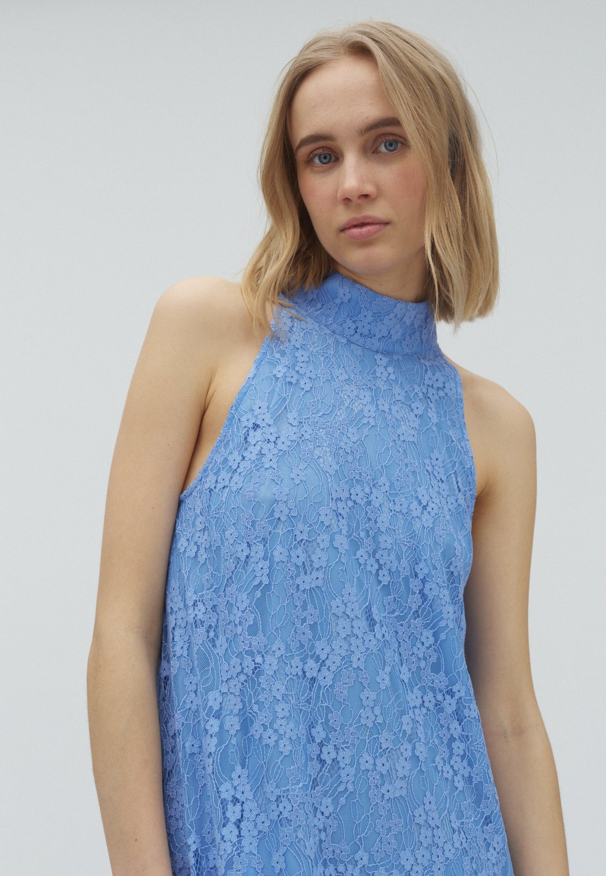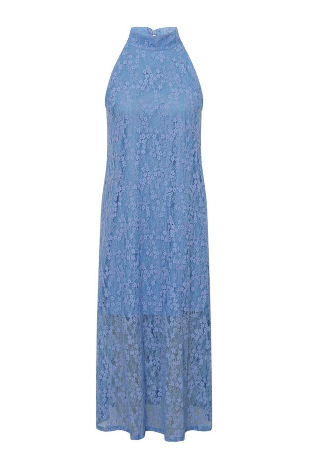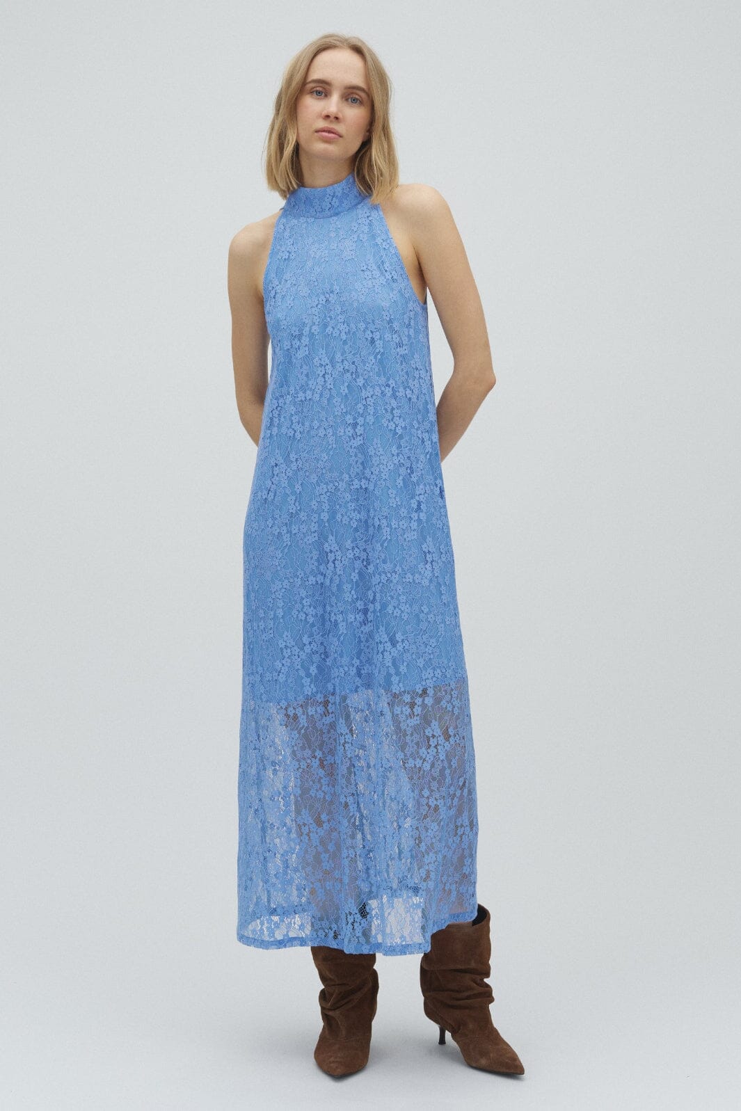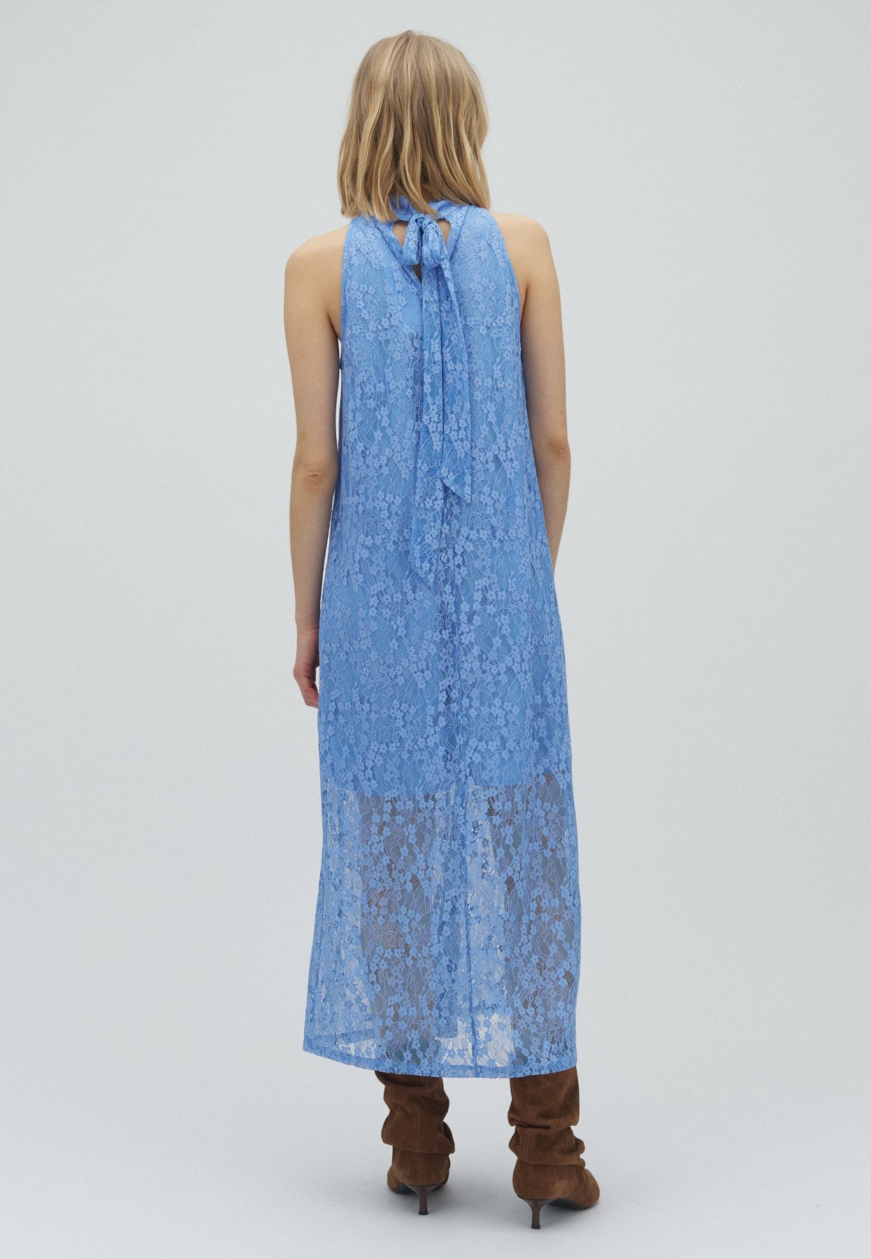 MbyM-mekko vaaleansinisessä pitsisessä kukkakuosissa. Mekko on hihaton, korkeakauluksinen ja ulottuu pohkeeseen.