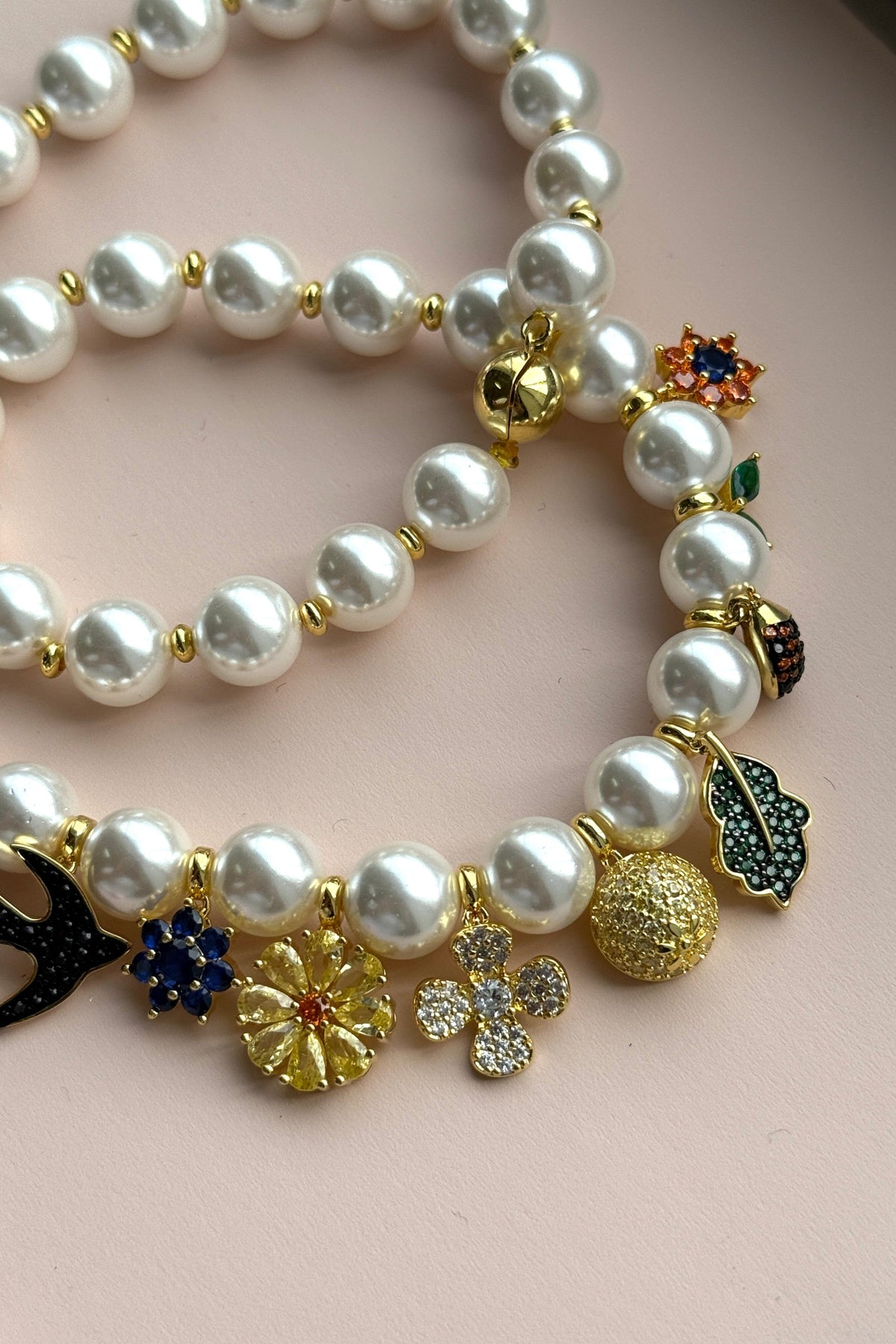 Kultaketju Mellow Moonilta, jossa on valkoisia helmiä ja värikkäitä charm-koristeita. Ketjussa on koristeellisia elementtejä, kuten kukkia ja lintuja eri väreissä.