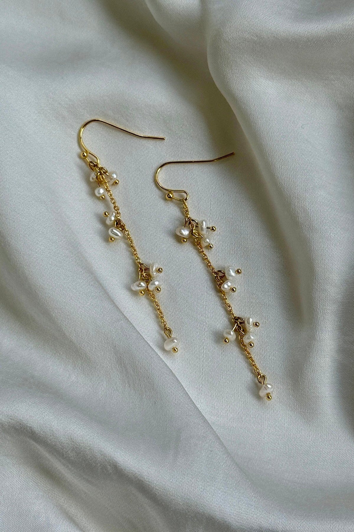 Ketjukorvakorut Mellow Moonilta, joissa on pieniä makeanvedenhelmiä hienossa kultaisessa ketjussa. Pitkät korvakorut on valmistettu kullatusta messingistä, jossa on aitoja helmiä jakautuneina ketjun varrella.