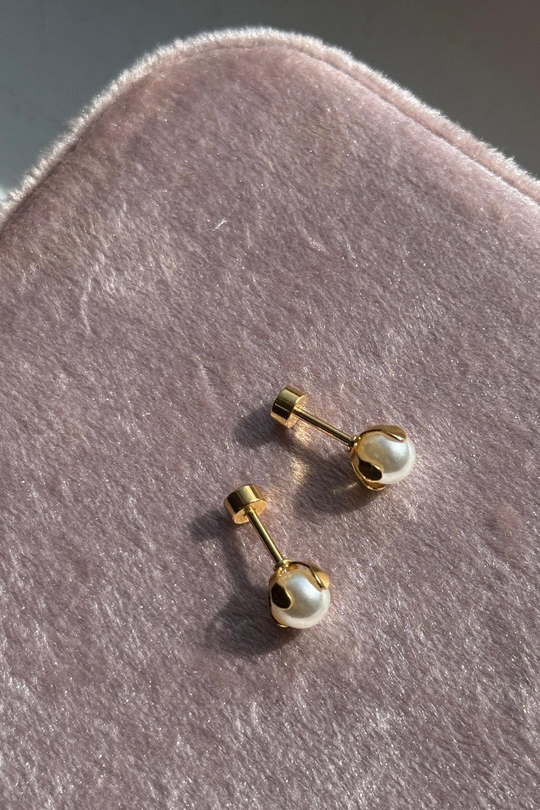 Kultapintaiset korvakorut Mellow Moonilta, joissa on pyöreät helmet päässä. Korvakoruissa on kiiltävä pinta ja yksinkertainen muotoilu, jossa helmi on kiinnitetty kultaiselle tangolle.