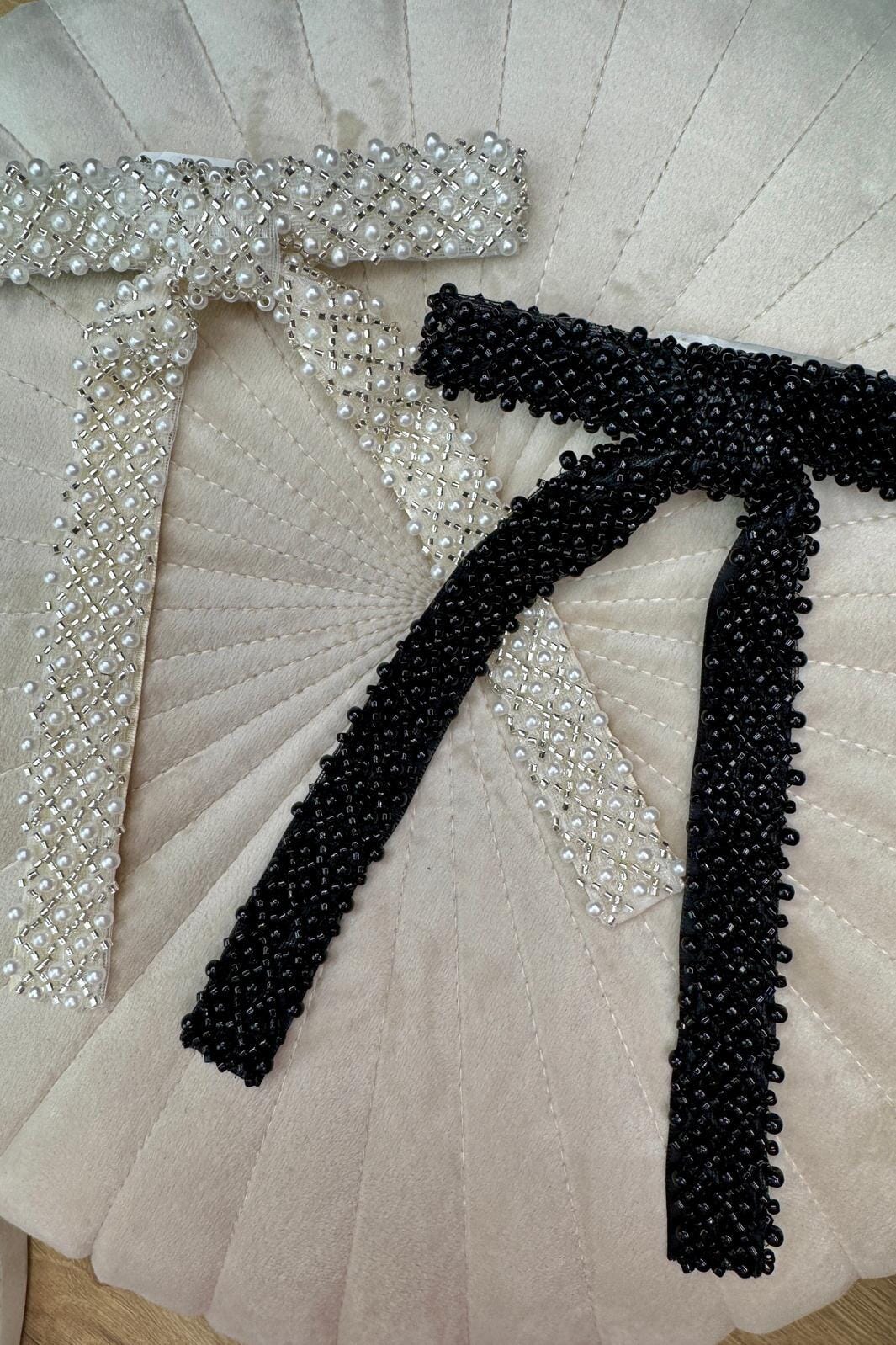 Mellow Moonin musta hiussolmu, jossa on helmikoristeita ristikkäismallissa. Solmussa on pitkät nauhat ja yksityiskohtainen pinta, jossa on pieniä mustia helmiä.
