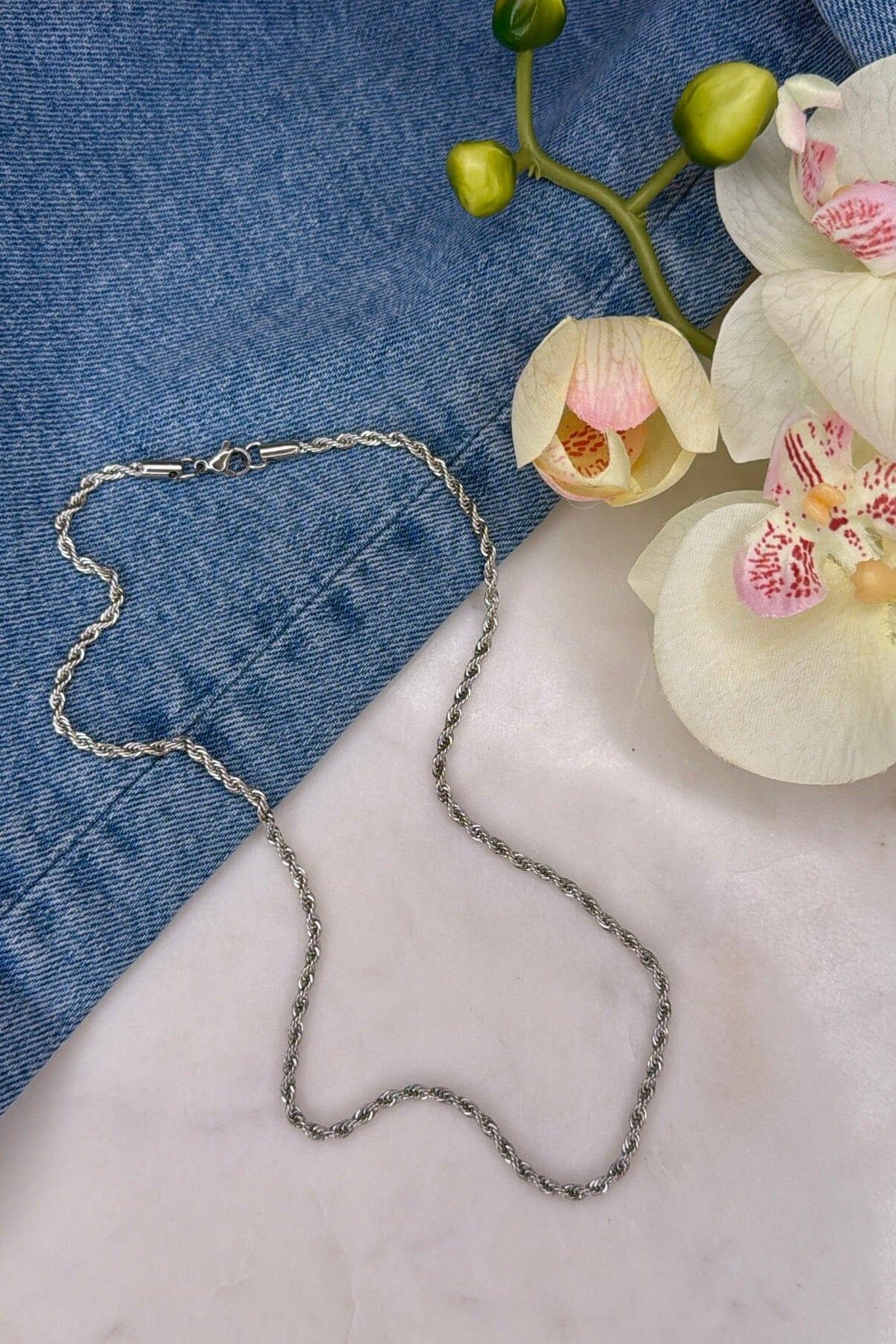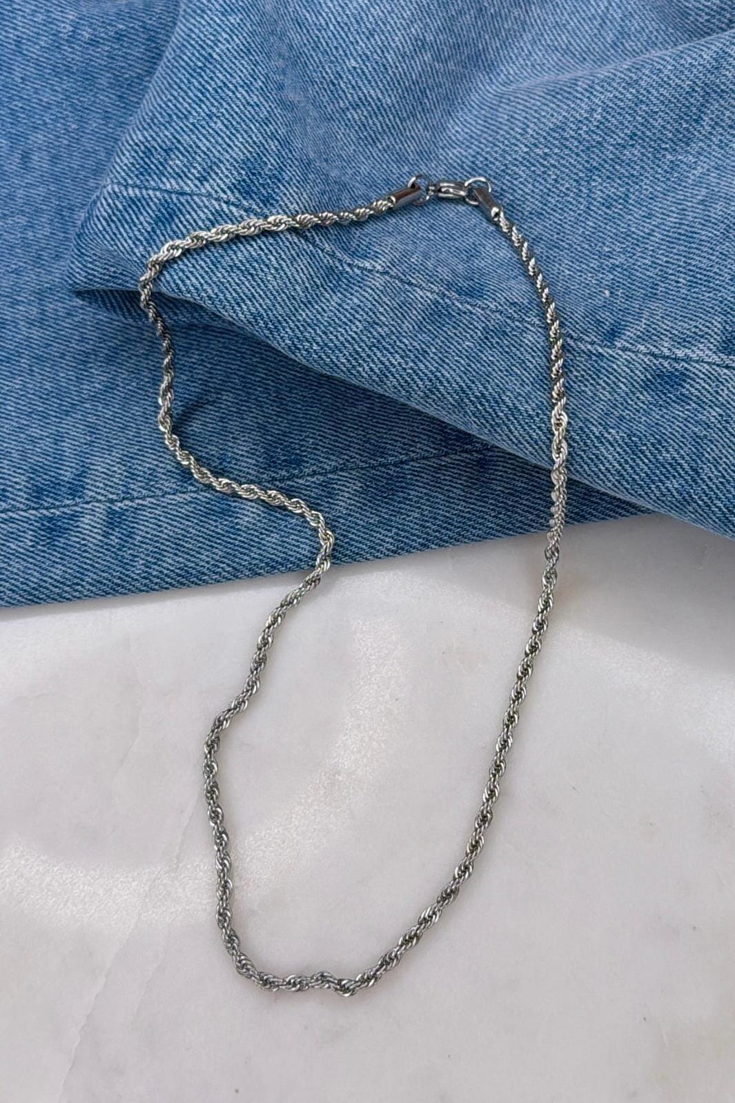 Hopeinen kaulakoru Mellow Moonilta kierretyllä muotoilulla. Ketjussa on hieno hopeinen pinta ja klassinen pituus, joka tekee siitä helpon yhdistää asuihin.