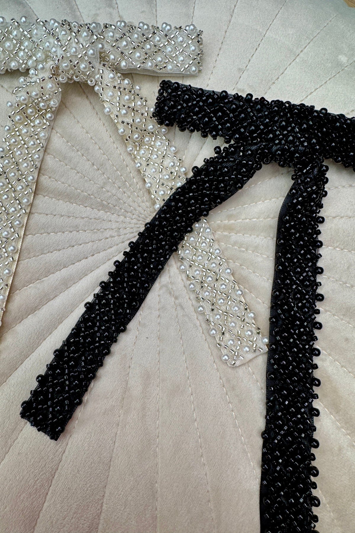 Valkoinen solmuke Mellow Moonilta, jossa on helmikoristelu ja ristikkokuvio. Solmukkeessa on yksityiskohtainen muotoilu, jossa pienet helmet muodostavat jatkuvan kuvion koko pinnalle.