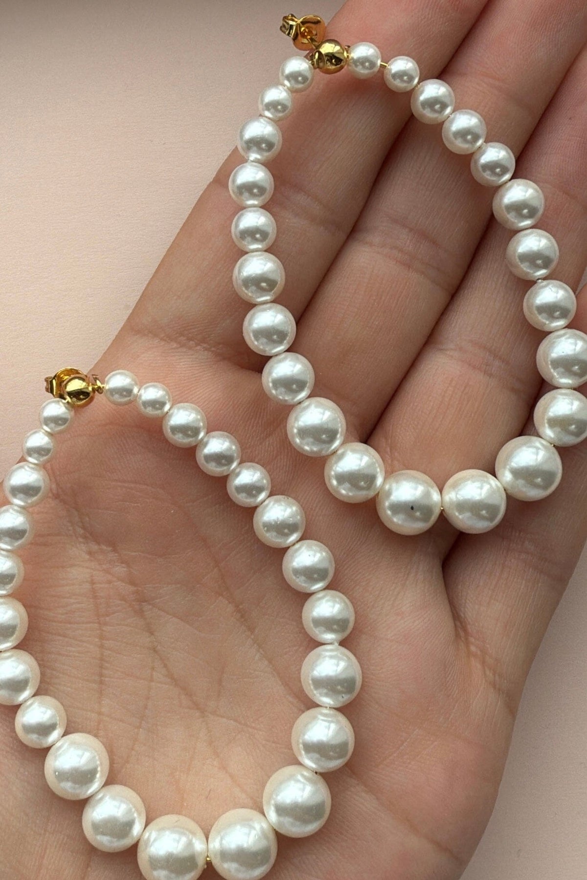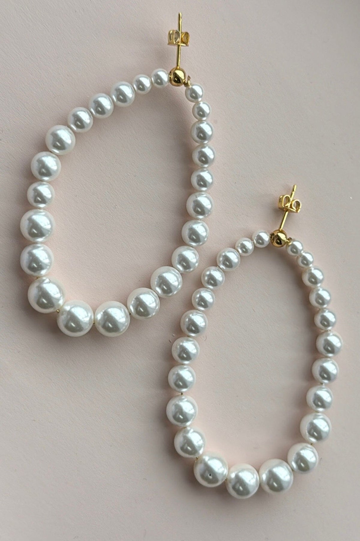 Suuret helmikorvakorut Mellow Moonilta kultaisilla yksityiskohdilla. Korvakoruissa on eri kokoisia helmiä, jotka on yhdistetty pisaramuotoon valkoisella ja kermansävyllä.
