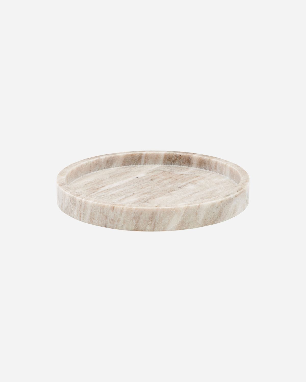 Pyöreä marmorialusta beigen värisenä, jossa on luonnollisia suonia. Alustalla on matala korkeus 3 cm ja halkaisija 25 cm, jossa on hieman kohotettu reuna.