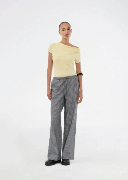 Keltainen Modström T-paita, jossa on drapeerattu pääntie. T-paidassa on lyhyet hihat ja vartaloa myötäilevä istuvuus.