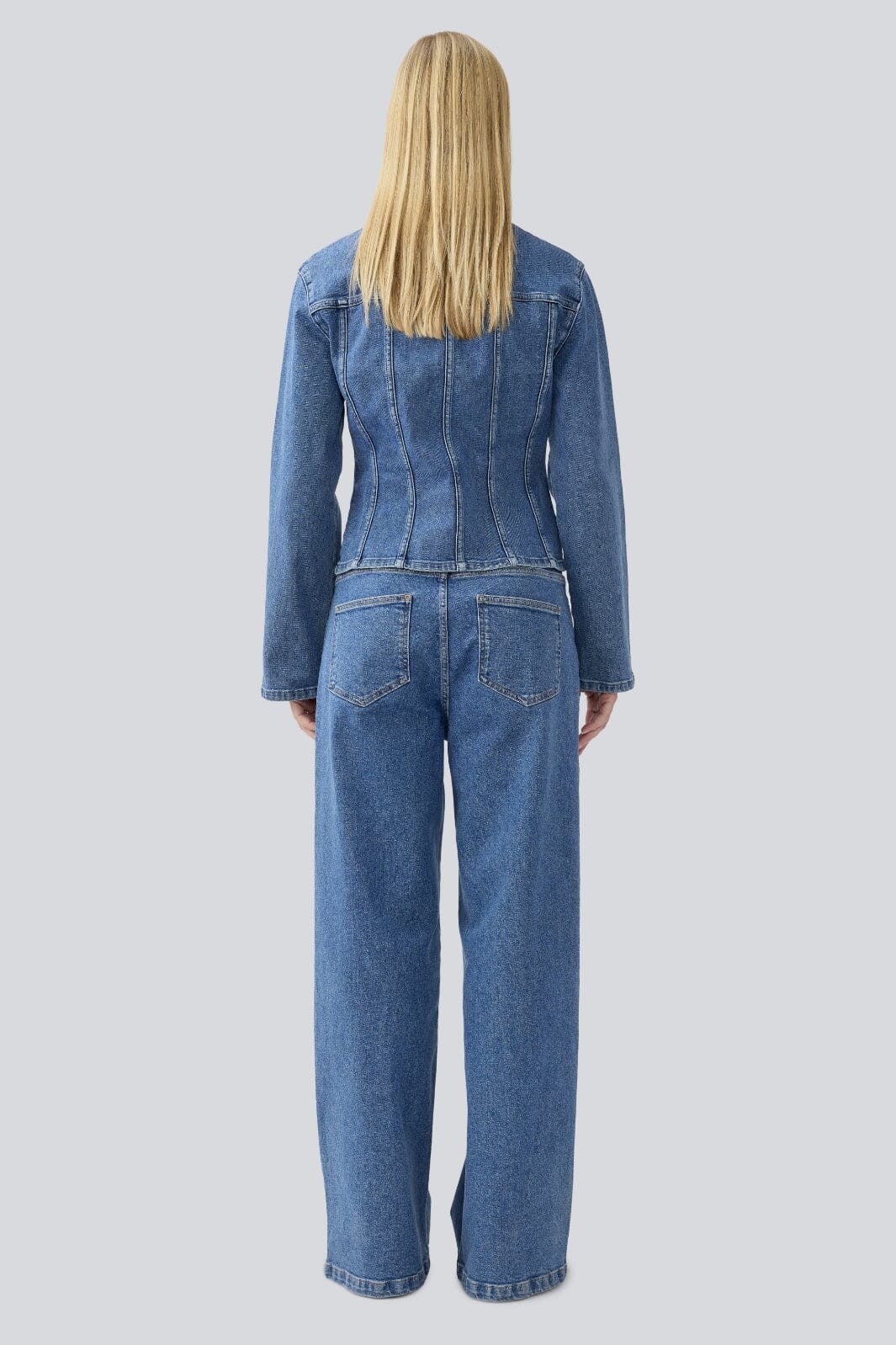 Siniset farkut Modströmilta korkealla vyötäröllä ja löysällä istuvuudella. Housuissa on vyötäröllä solmittava nauha ja leveät lahkeet, jotka tarjoavat hyvää liikkuvuutta.