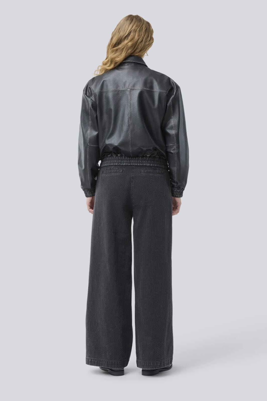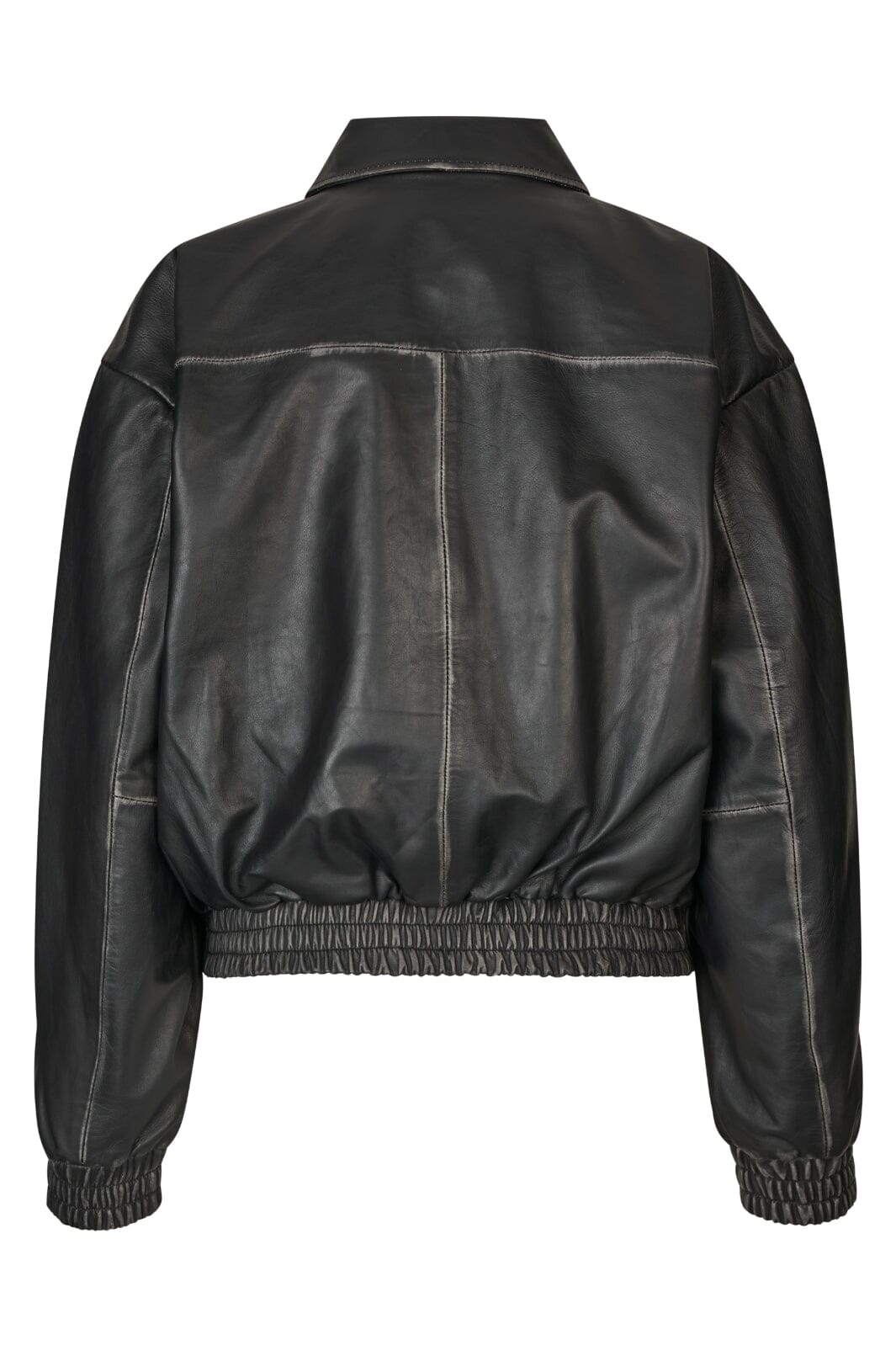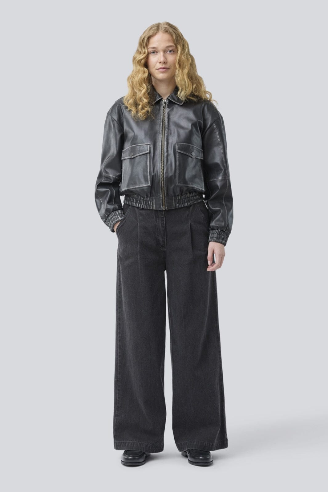 Musta nahkatakki Modströmilta, jossa on kauluspaita ja etuvetoketju. Takissa on oversized-mitoitus ja kaksi suurta etutaskua napilla edessä.