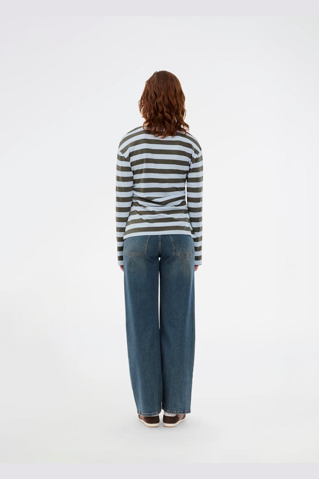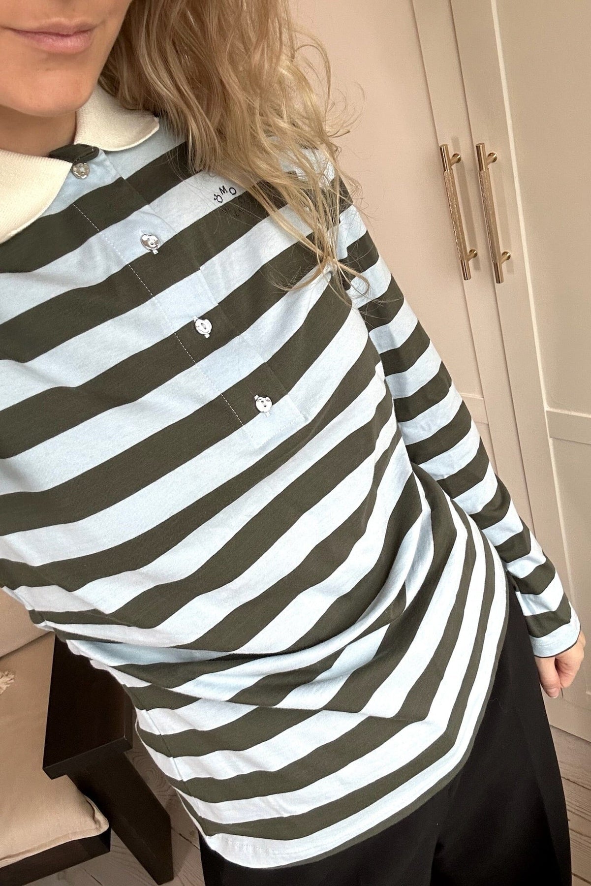 Modström pitkähihaista polo-paitaa ekologisesta puuvillasta. Suunniteltu vaakasuorilla raidoilla vaaleansinisissä ja tummanvihreissä sävyissä sekä valkoisella polo-kauluksella, jossa on nappisuljenta.