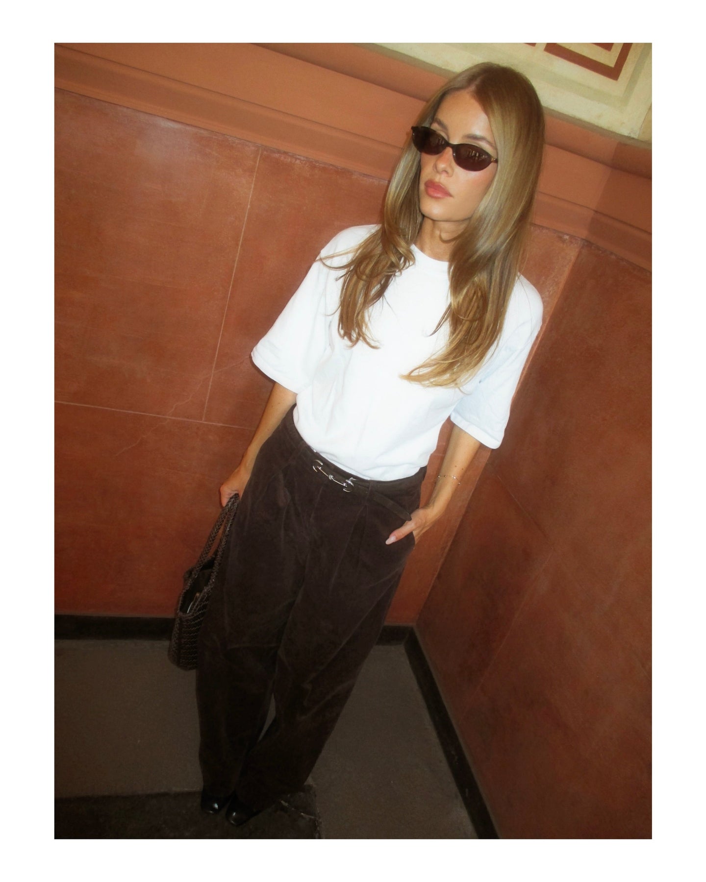 Valkoinen t-paita Modströmiltä, joka on valmistettu luomupuuvillasta. T-paidassa on vartalonmyötäinen malli, leveät lyhyet hihat ja pyöreä kaula-aukko.