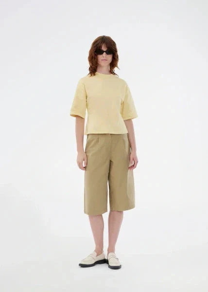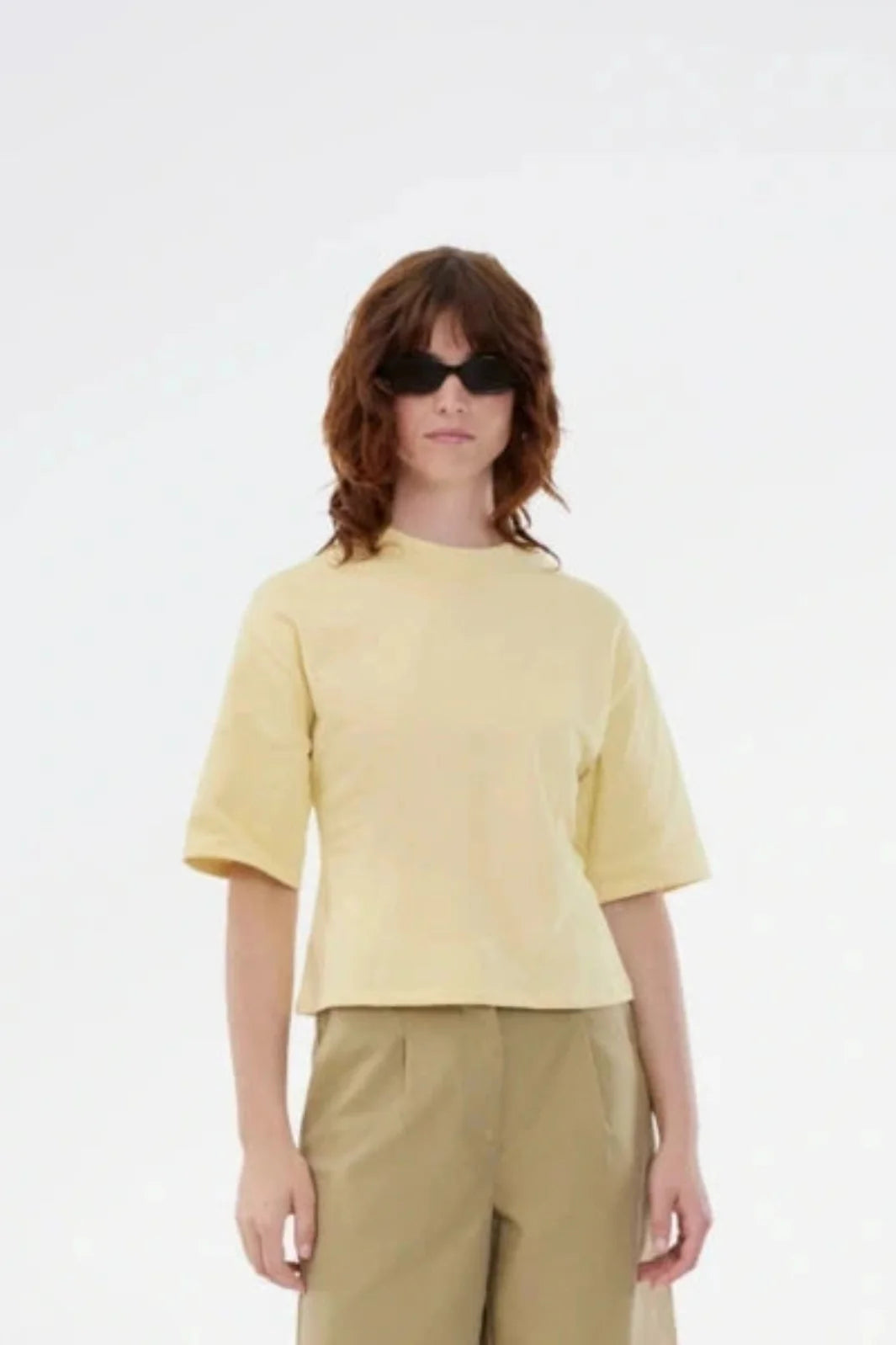 Vaaleankeltainen Modström-t-paita, valmistettu 100 % luomupuuvillasta. T-paita on kevyesti cropattu ja siinä on vartalonmyötäinen istuvuus.