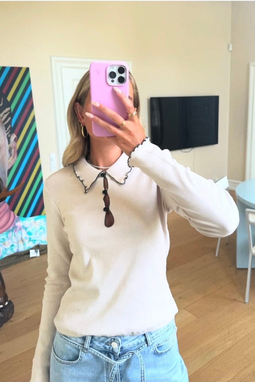 Modströmin toppi vaaleanbeigessä sävyssä. Topissa on Peter Pan -kaulus, jossa on aaltoileva kontrastivärinen reuna, sekä nappikiinnitys edessä.
