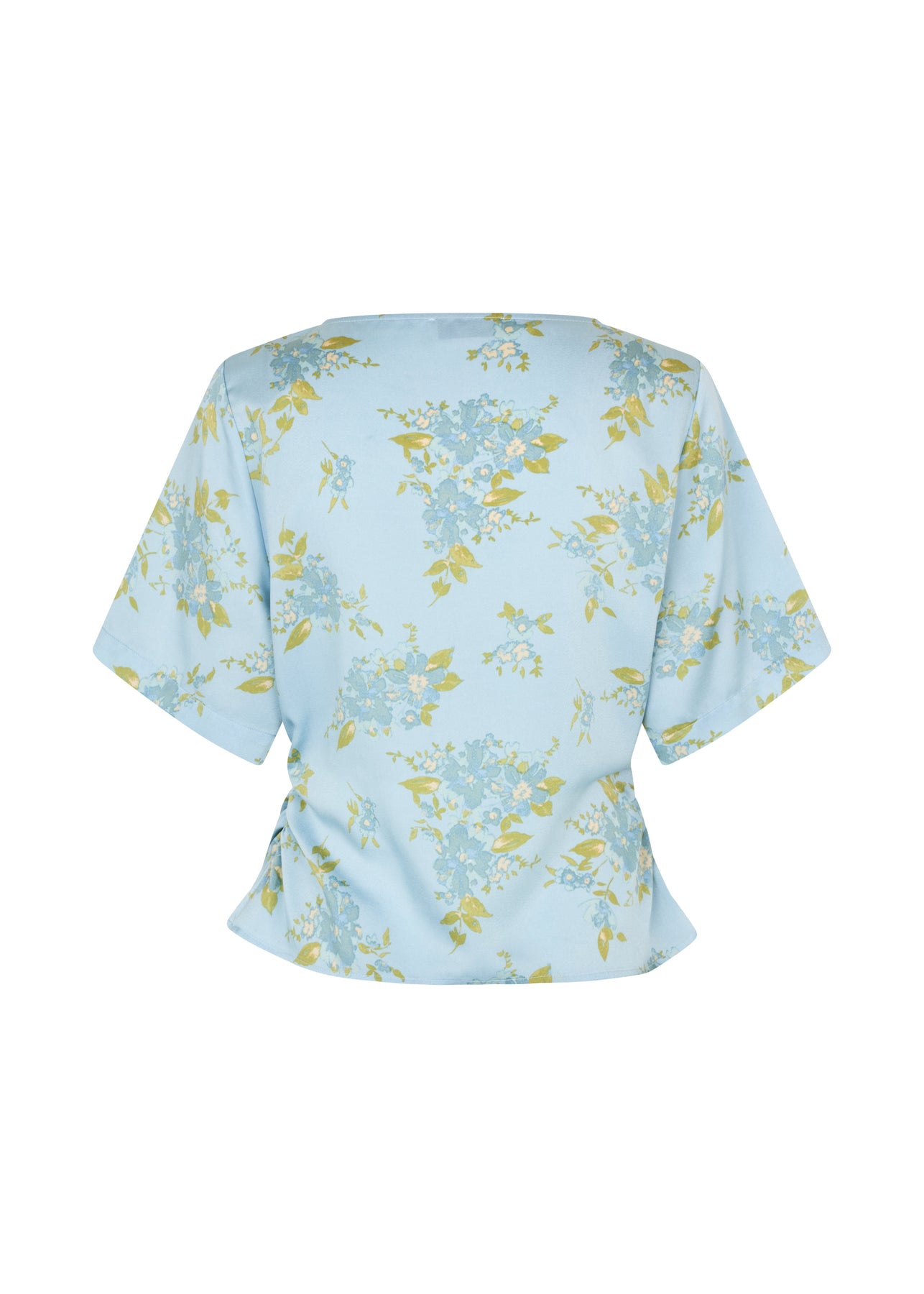 Modström-toppi, jossa on kukkakuvio vaaleansinisellä taustalla. Topissa on lyhyet hihat ja pyöreä pääntie.