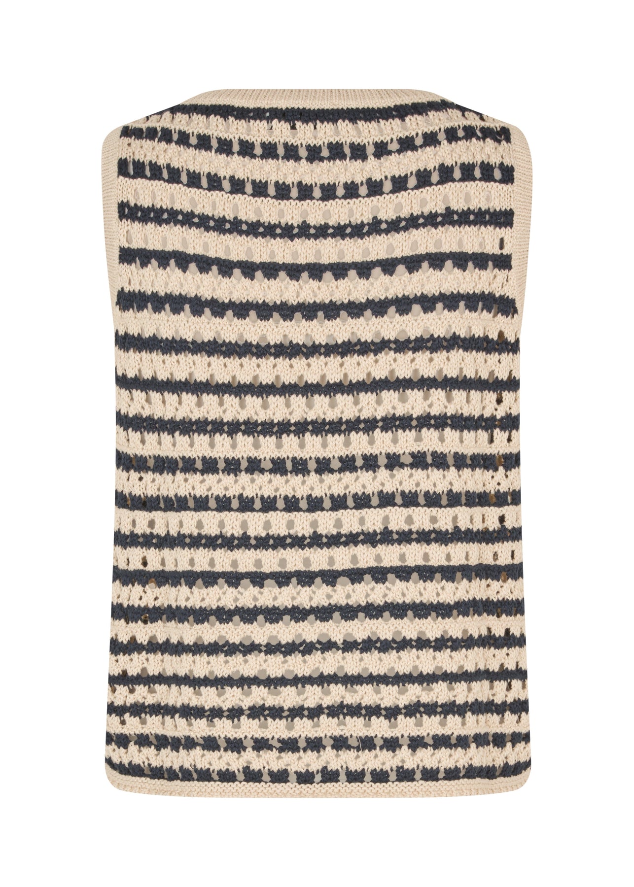 Raidallinen neuletoppi Modströmiltä tummansinisissä ja hiekanvärisissä sävyissä. Hihaton toppi on pitsikuvioitu ja valmistettu 100 % luomupuuvillasta.