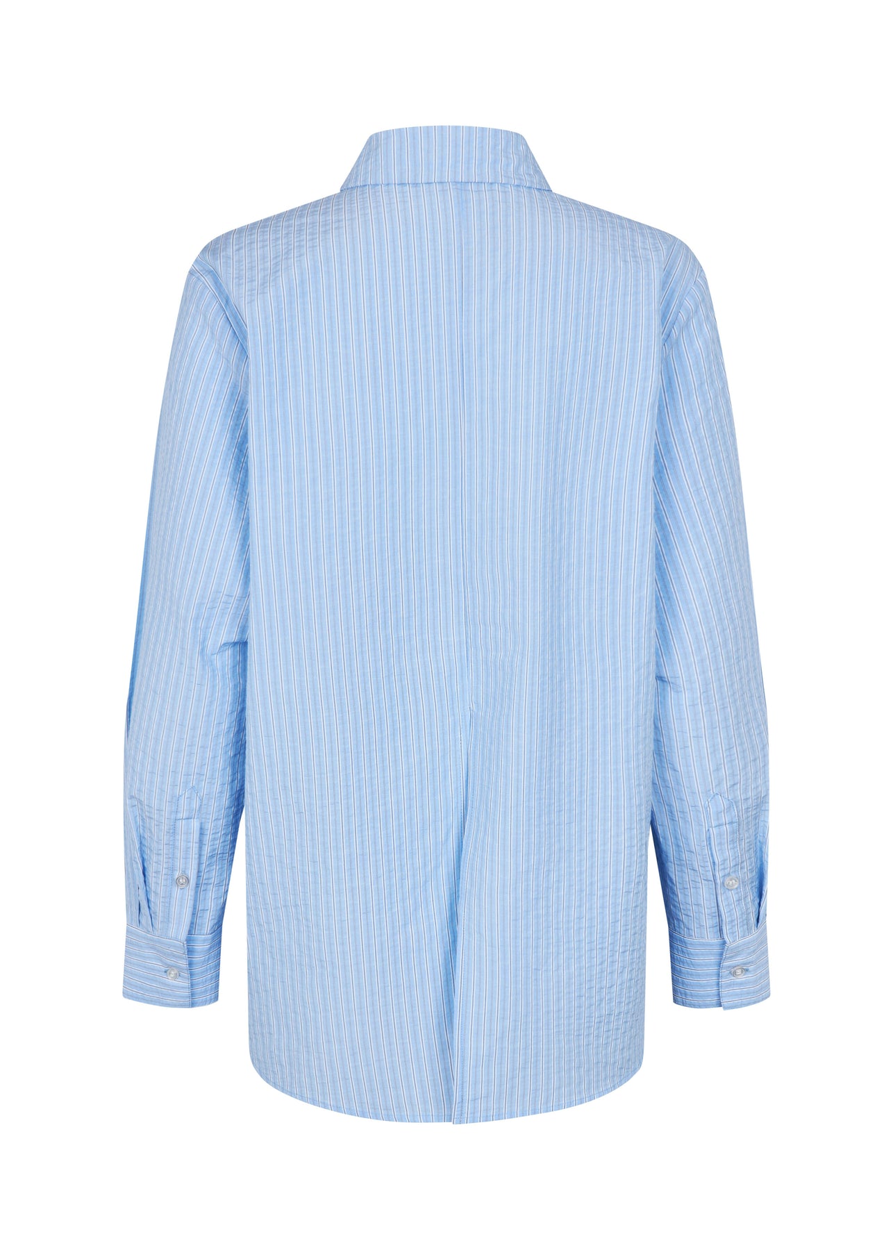 Raidallinen Modström-paita sinisenä ja valkoisena. Paidassa on oversize-istuvuus ja pitkät hihat, joissa on kalvosimet.