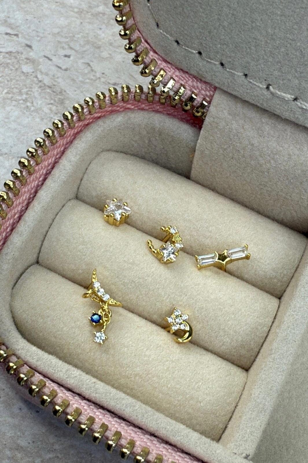 Molly&My Jewellery -korvakorut, jotka on valmistettu ruostumattomasta teräksestä ja joissa on kullattu hopeapinta. Koruissa on kultaisia yksityiskohtia ja erimuotoisia kiviä.