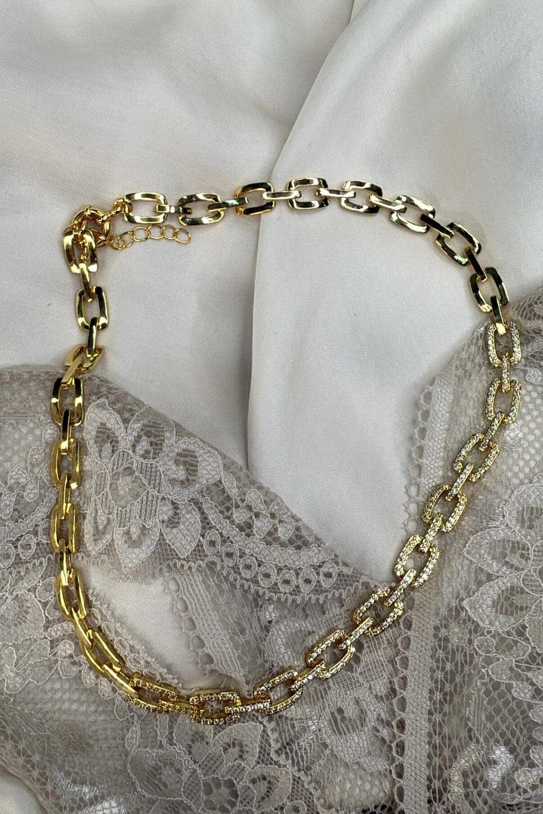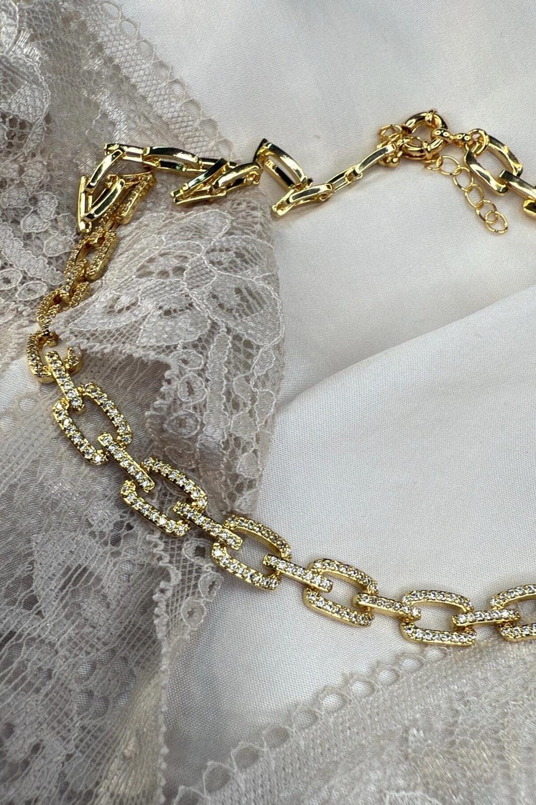 Kullattu kaulakoru Molly&My Jewellery -merkiltä, jossa on suorakulmaiset lenkit. Joitakin lenkkejä koristavat pienet, kiiltävät kivet. Ketjussa on säädettävä lukko.