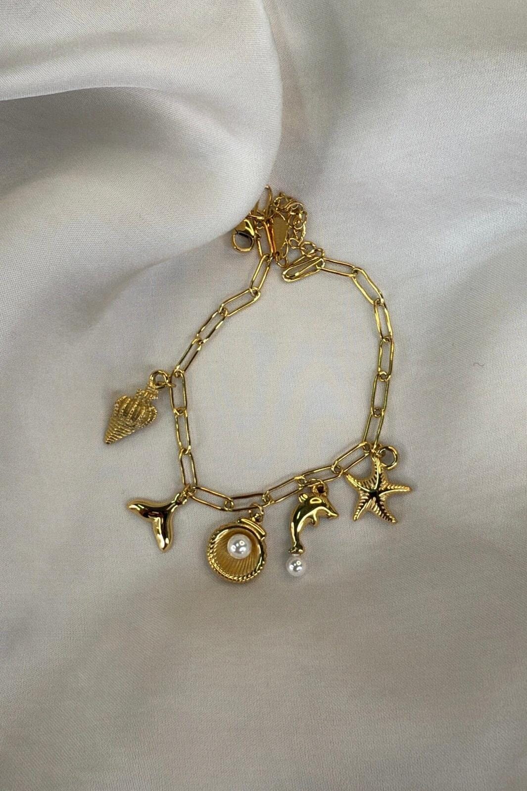 Kullattu rannekoru Molly&My Jewellery -merkiltä, jossa on riipuksia kuten delfiini, tähti, simpukka ja pyrstö ketjussa, jossa on soikeat lenkit.