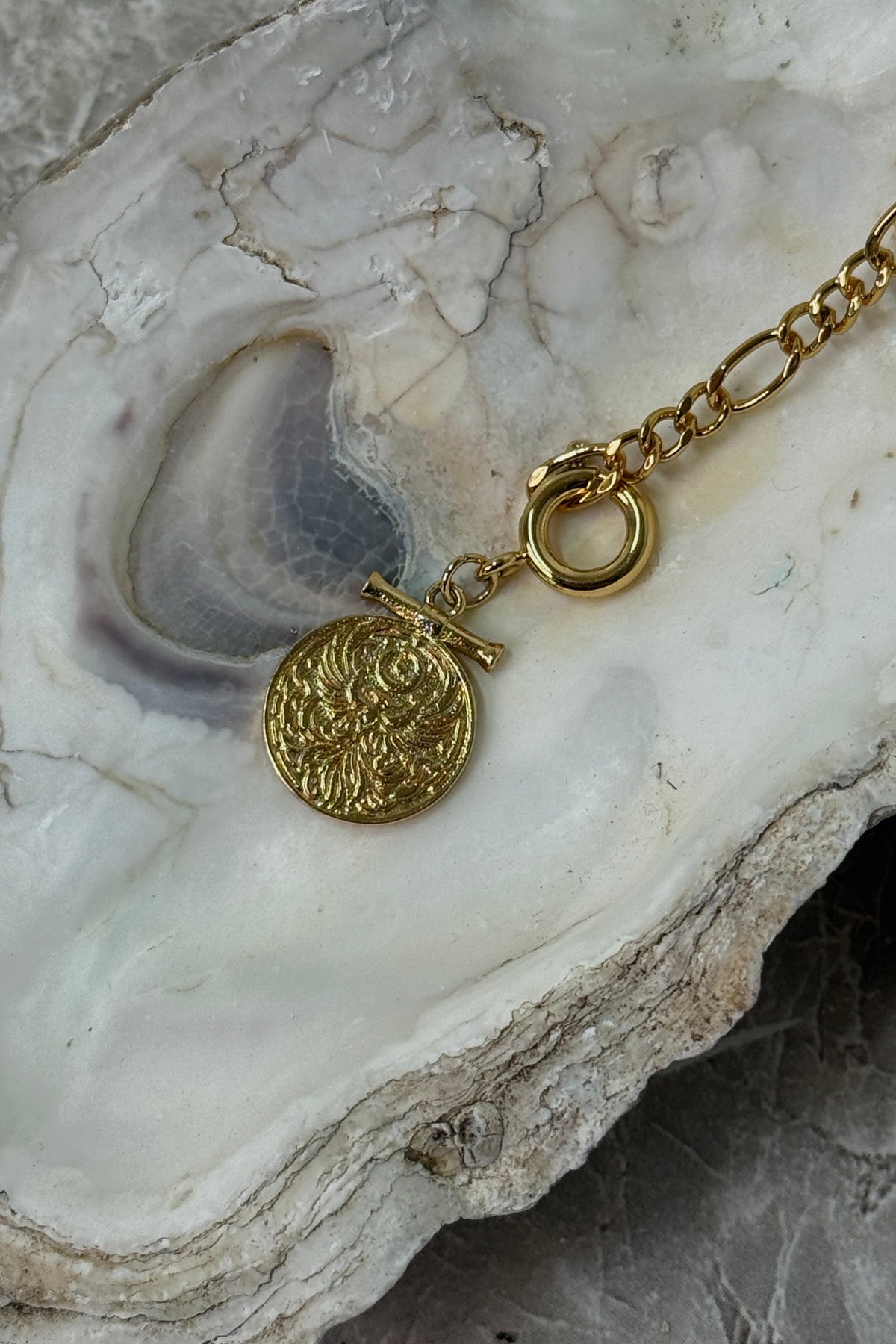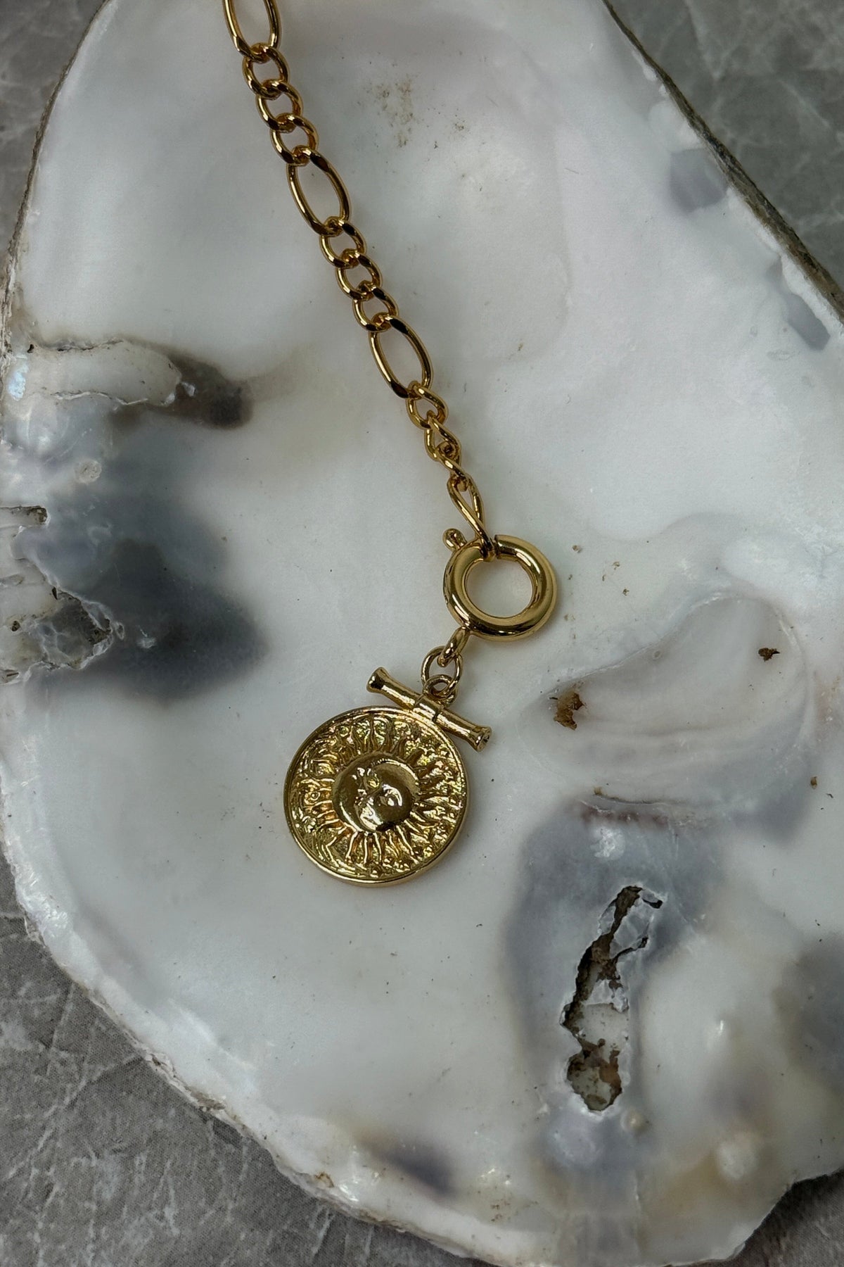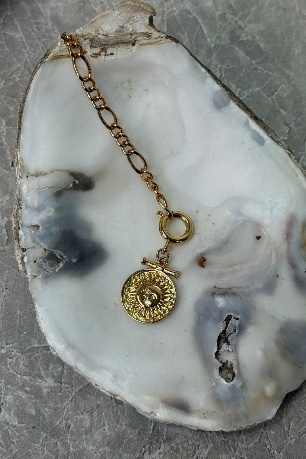 Kullattu medaljonki ruostumattomasta teräksestä, Molly&My Jewellery x Melanie Due, jossa kaiverrettu aurinko- tai kasvokuvio ovaalilenkkisessä ketjussa.