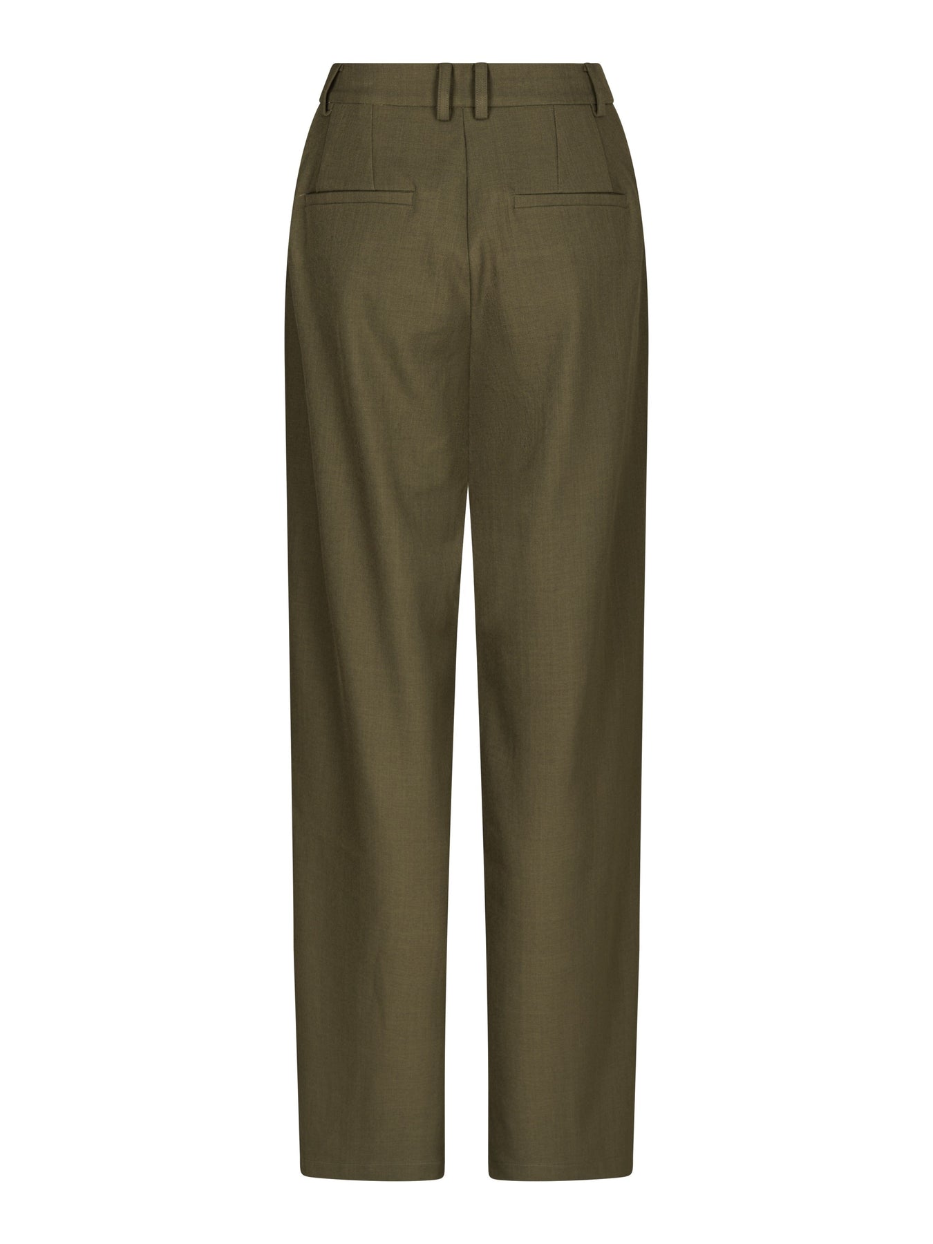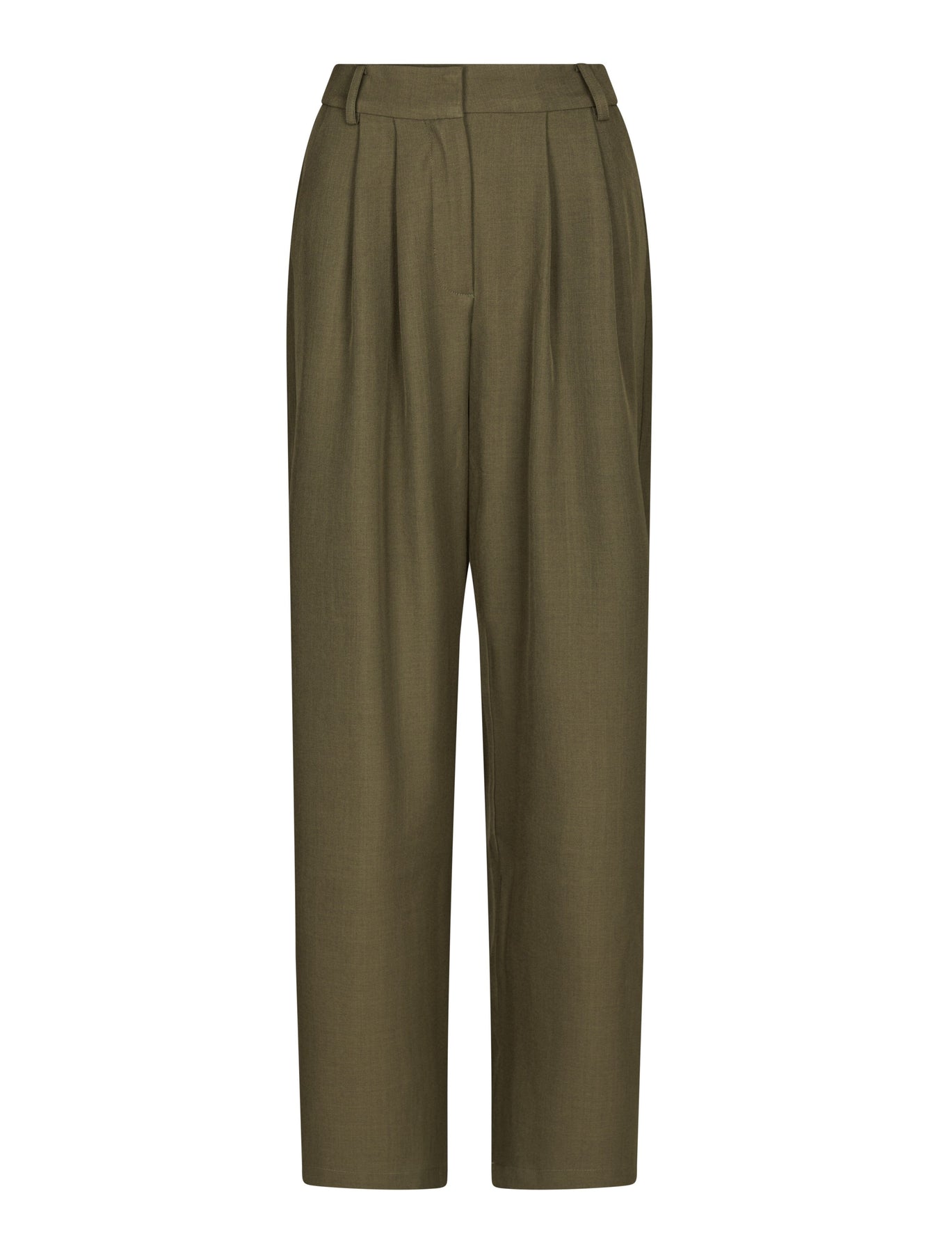 Khakinväriset Molly&My x Julie Elgaard -housut, joissa on leveät lahkeet ja jämäkkä, strukturoitu istuvuus. Housuissa on korkea vyötärö ja lattiaan ulottuva pituus.