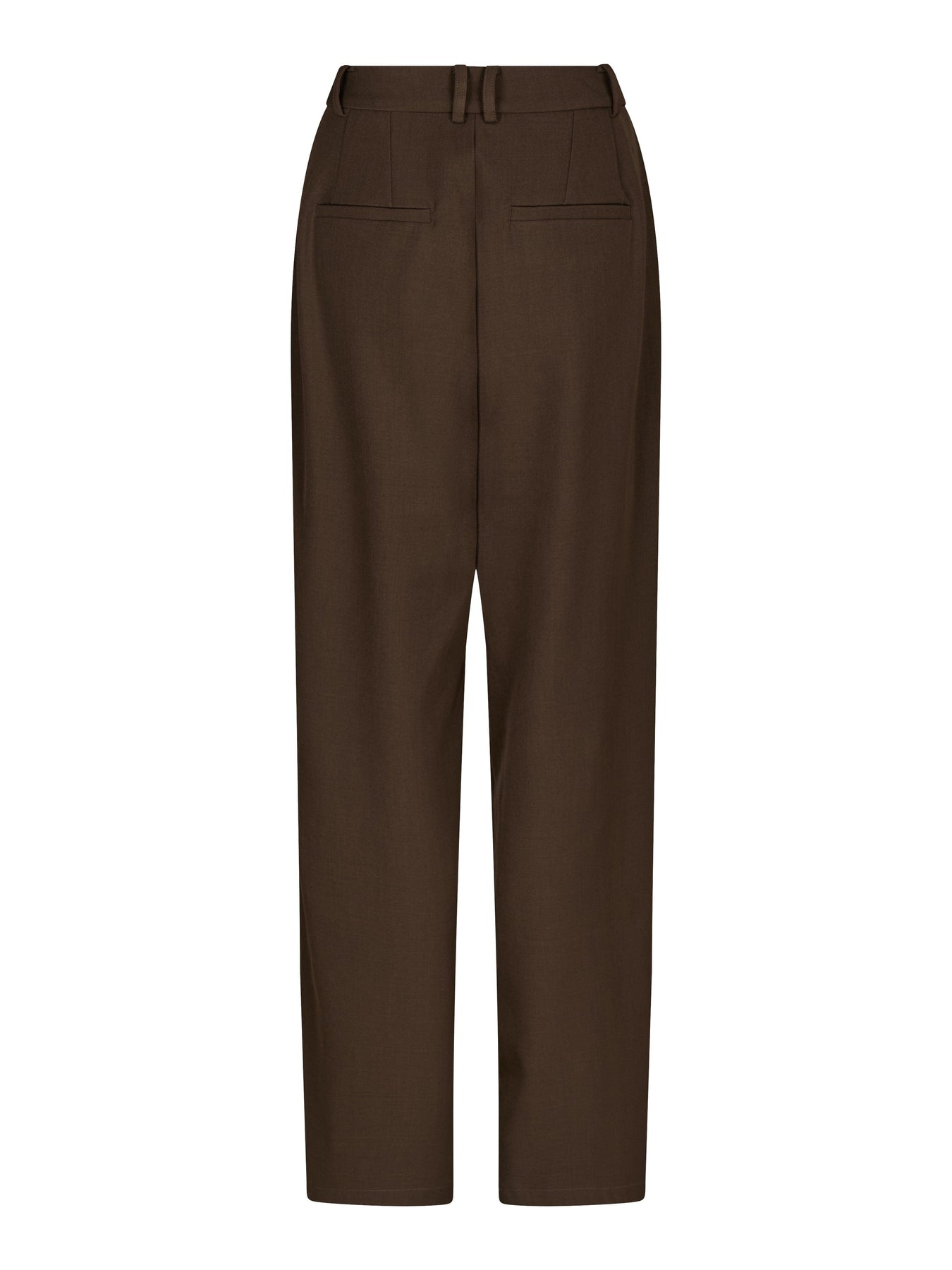 Tummanruskeat Molly&My x Julie Elgaard -housut, joissa on väljä istuvuus ja lattiaan ulottuva pituus. Housuissa on korkea vyötärö ja ne suljetaan vetoketjulla ja napeilla.