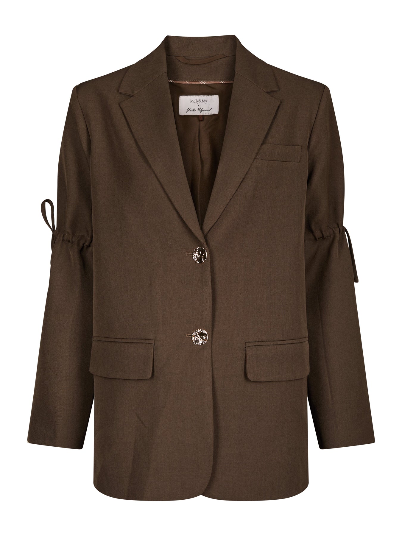 Tummanruskea bleiseri Molly&My x Julie Elgaard -mallistosta, jossa on nyöritysyksityiskohdat hihoissa. Bleiserissä on oversize-istuvuus ja V-pääntie.