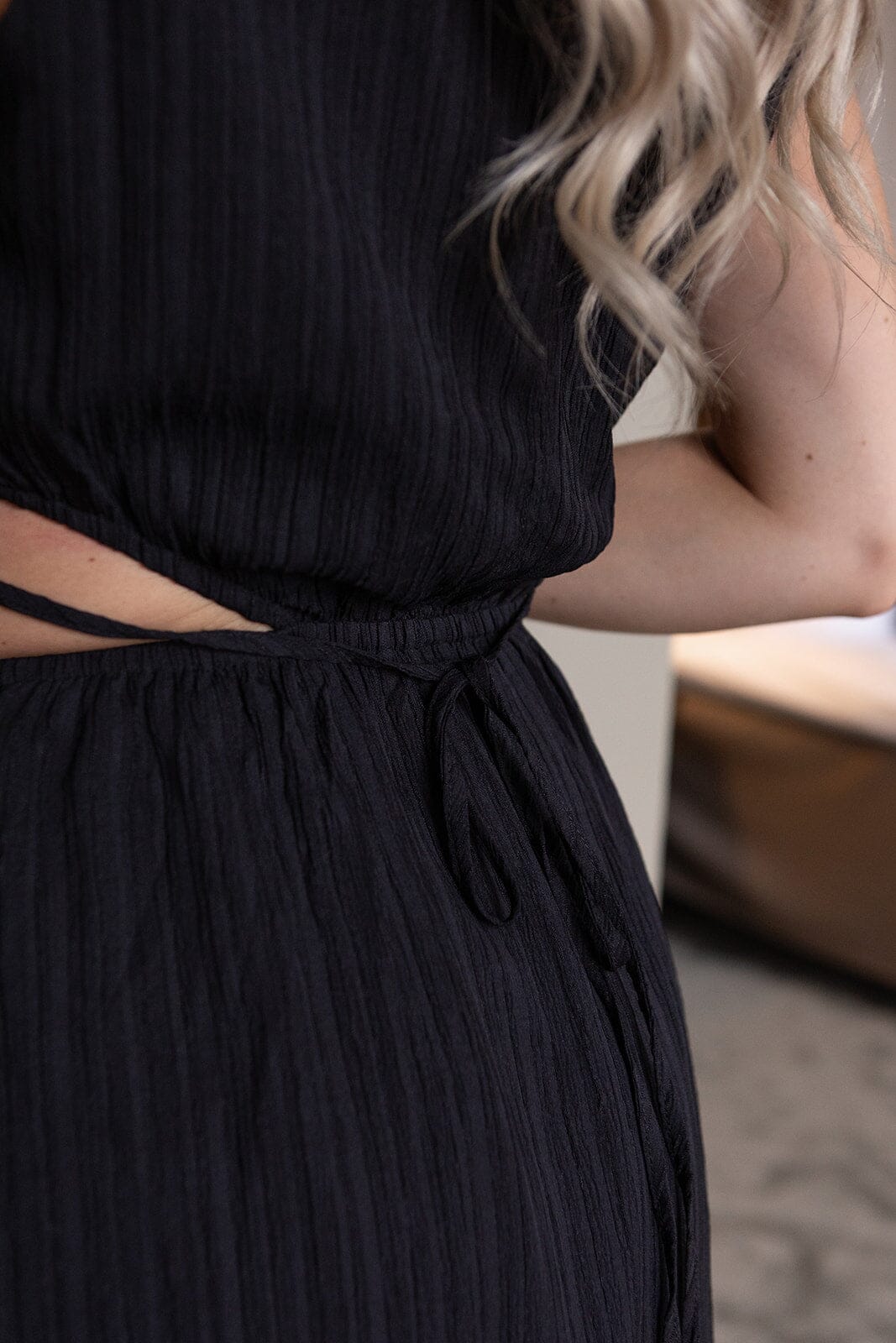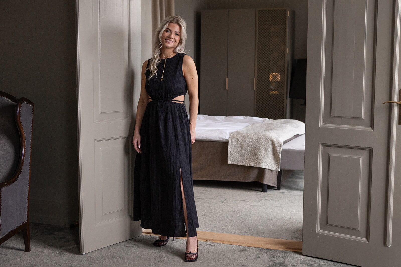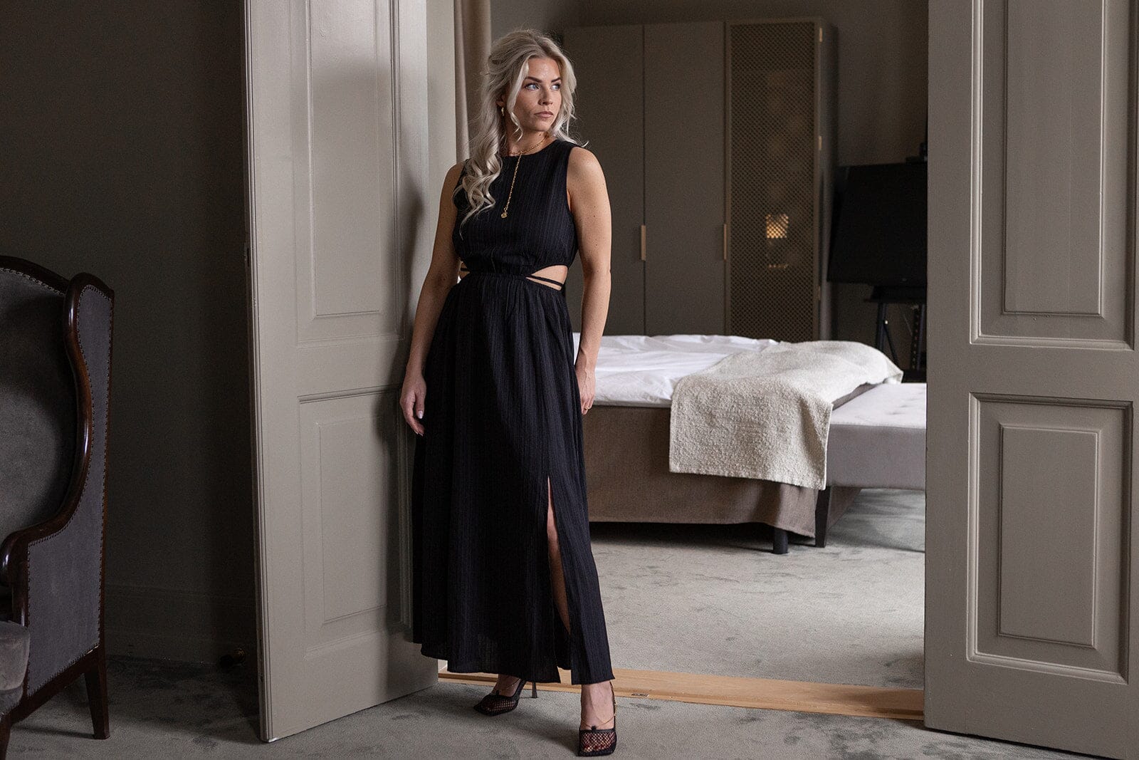 Musta Molly & My X Melanie Due -mekko, jossa hihaton malli, leikkaukset vyötäröllä ja halkio sivussa. Mekko ulottuu nilkkaan asti.