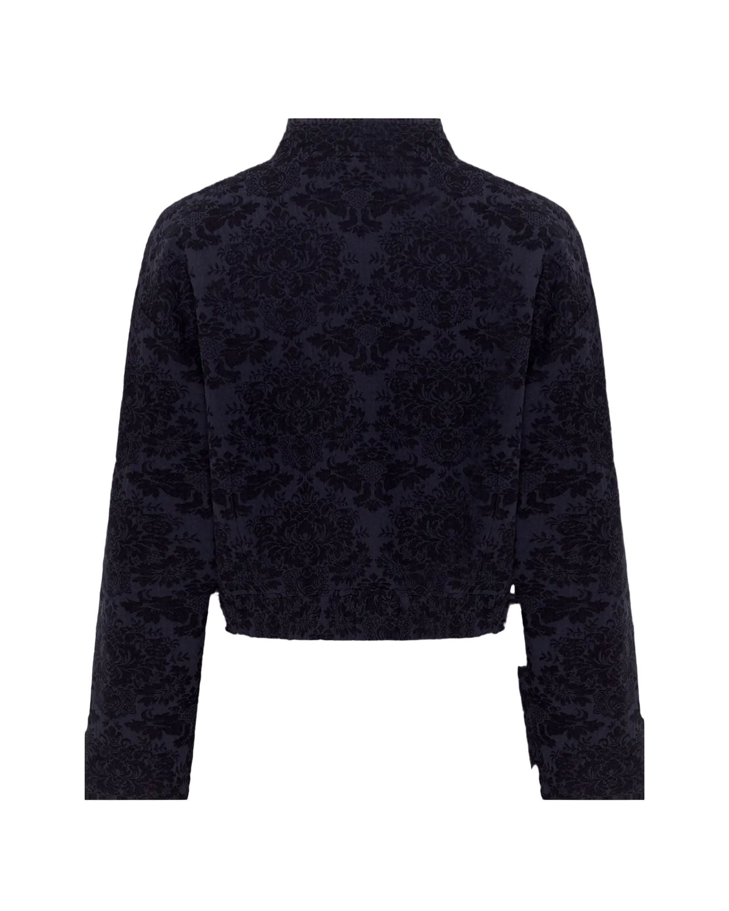 Takki Moss Copenhagenilta tummansinisessä sävyssä, jossa on kukkakuvio koko kankaassa. Takissa on pitkät hihat ja pystykaulus.