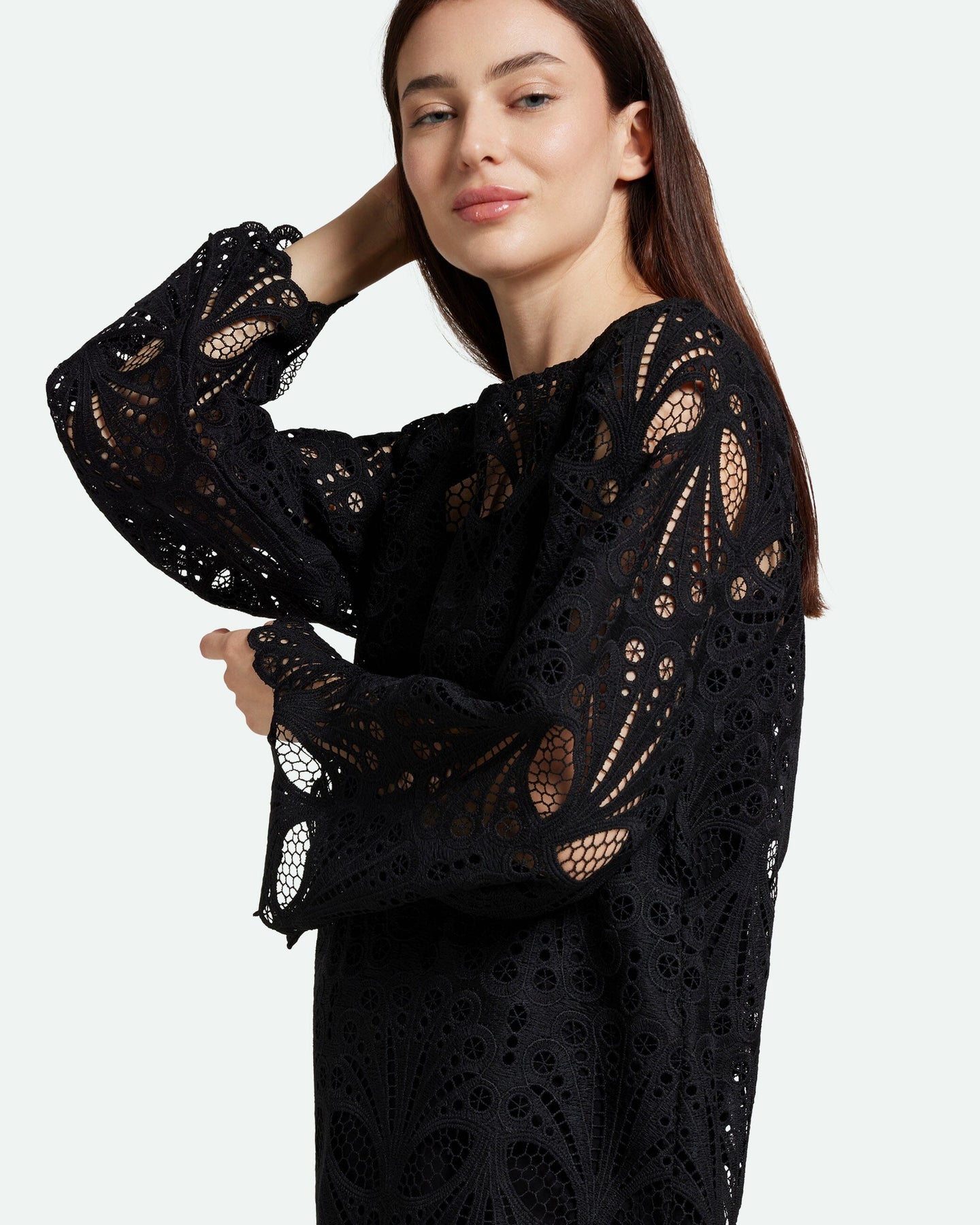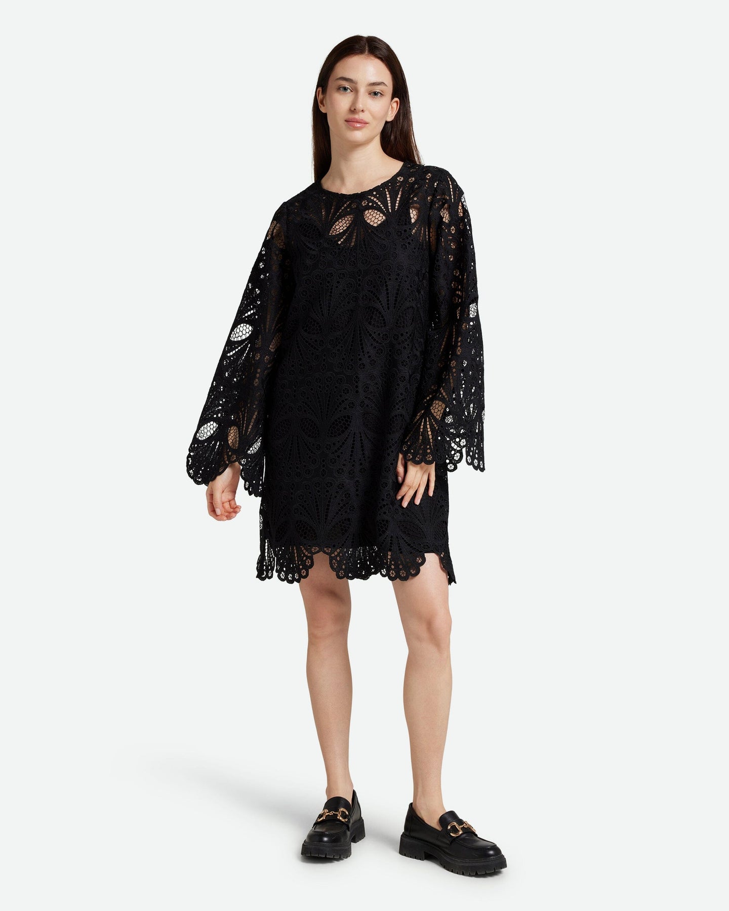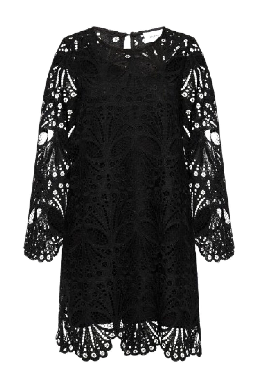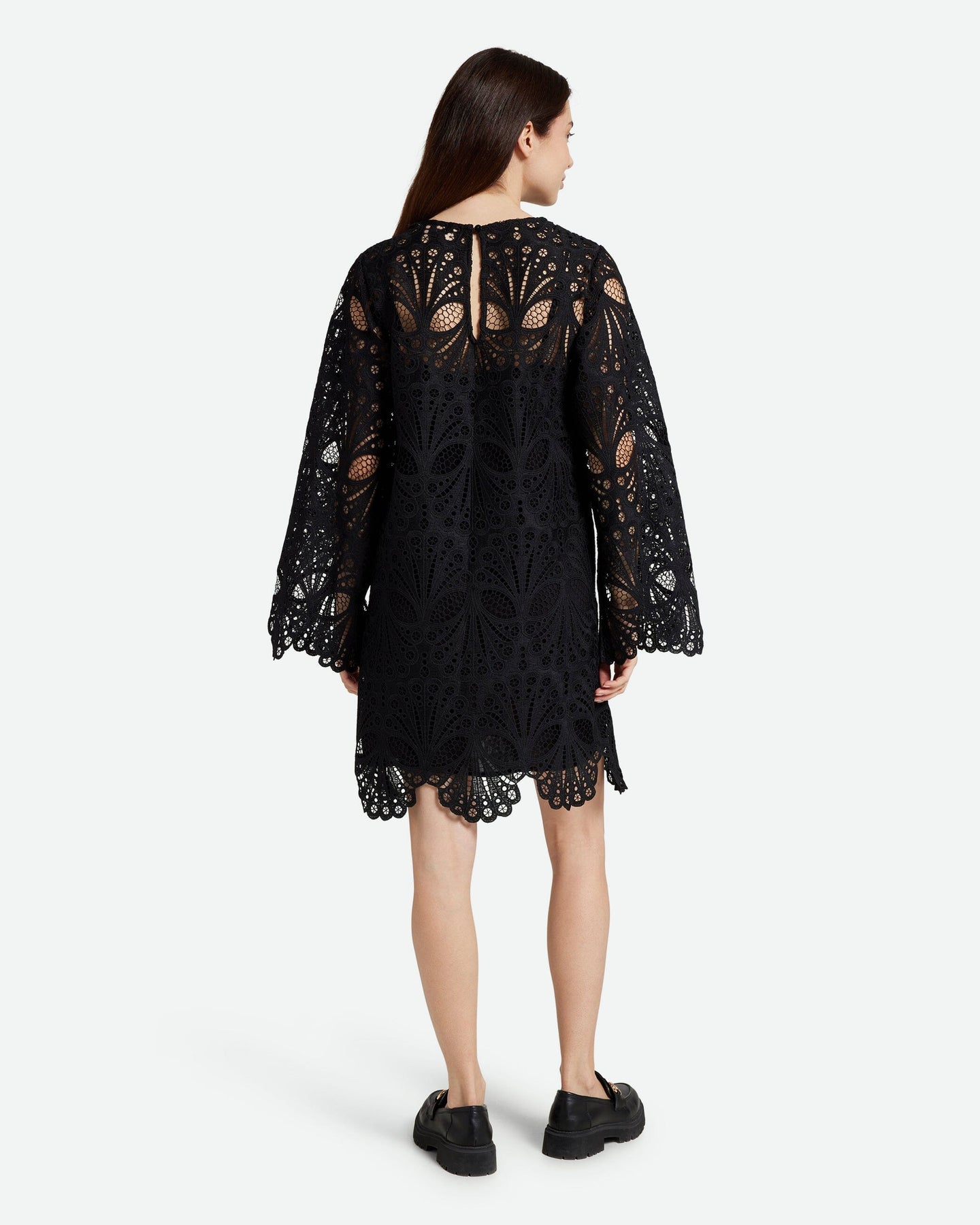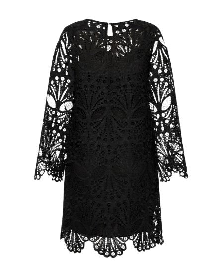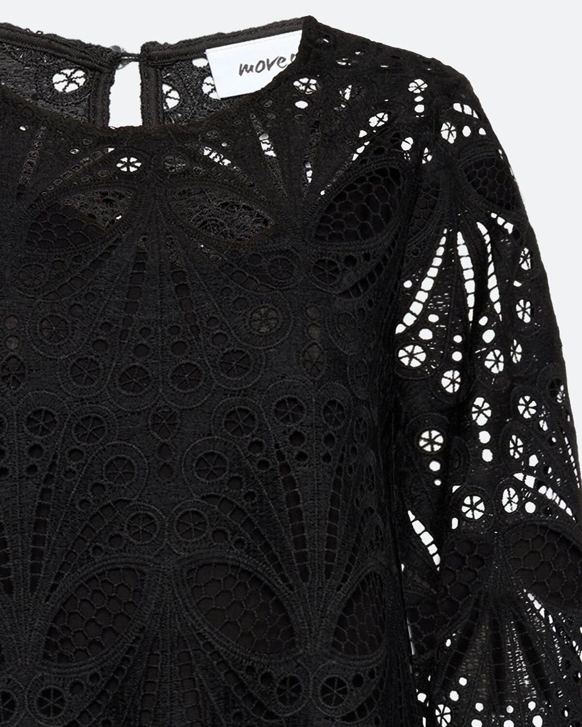 Musta pitsimekko Movesilta kukkakuviolla. Mekossa on pyöreä pääntie, 3/4-hihat ja se ulottuu reiteen. Siinä on sisävuori ja läpi kulkeva pitsikuvio.