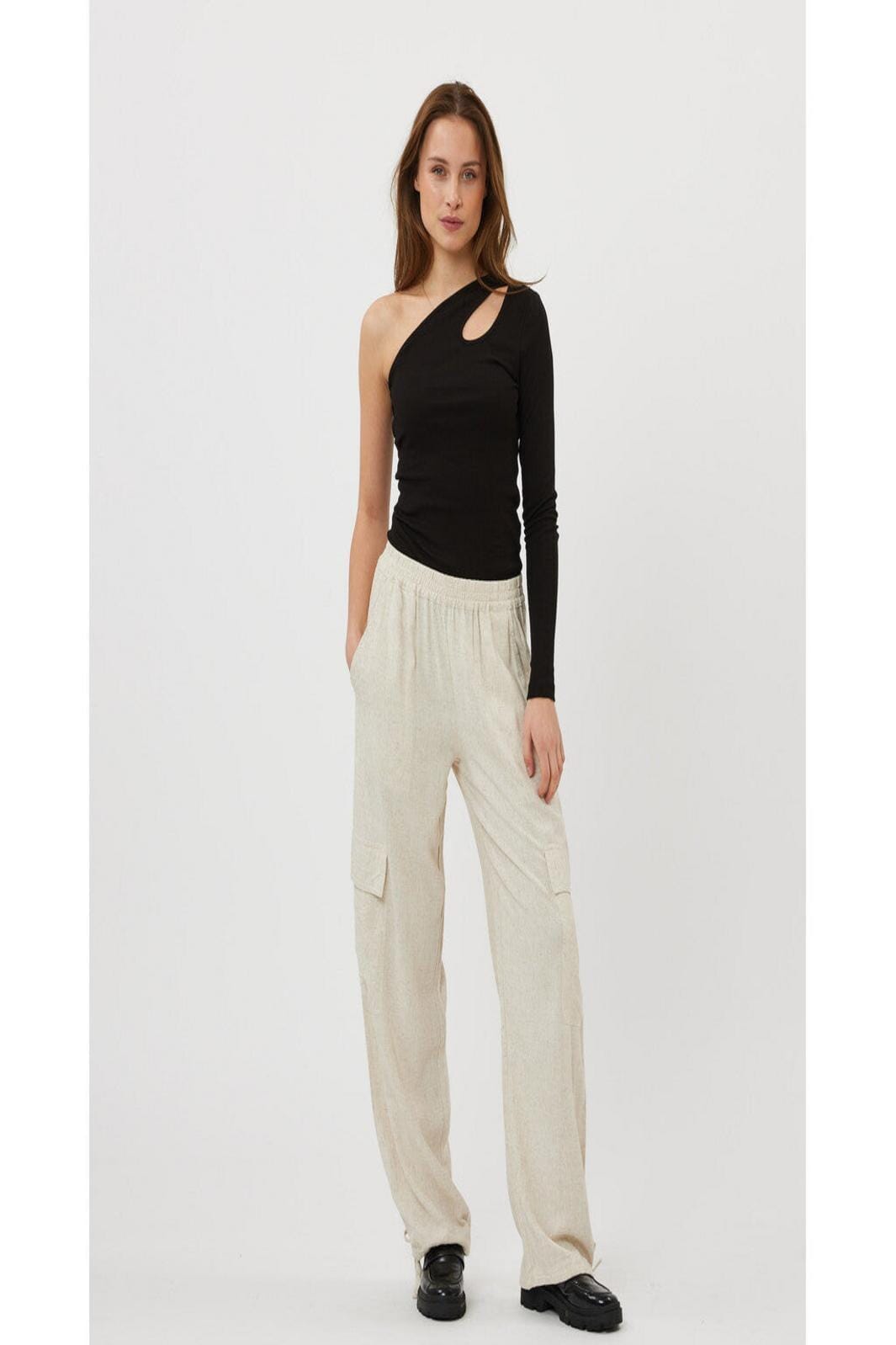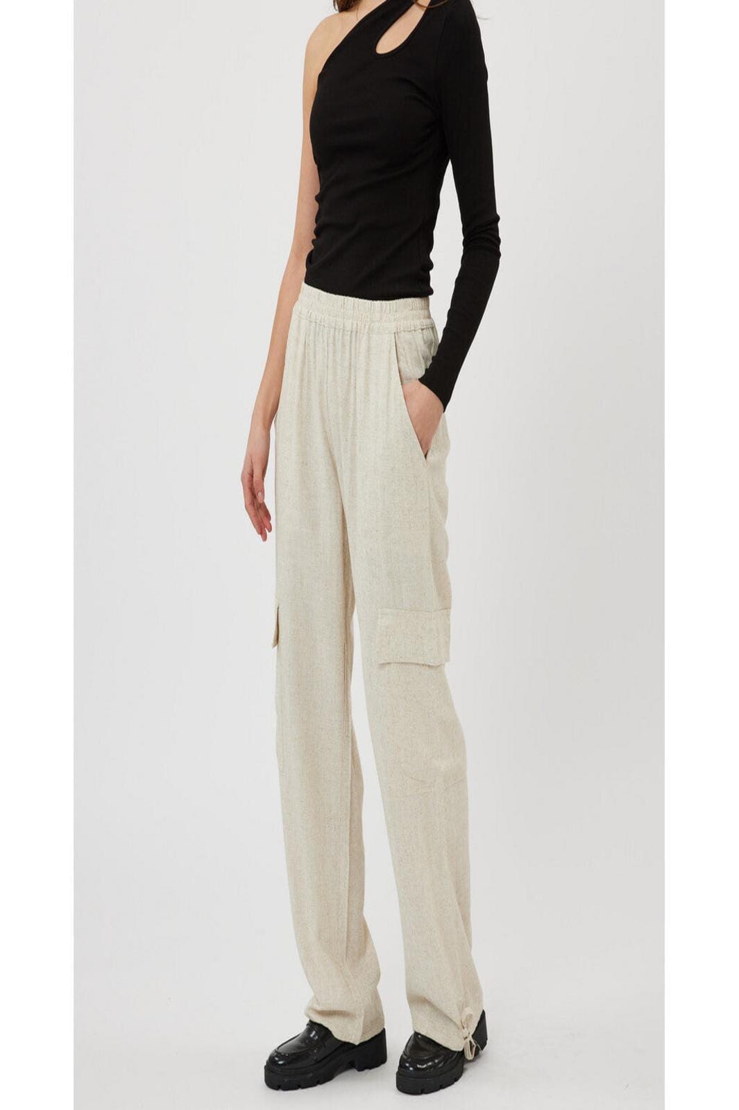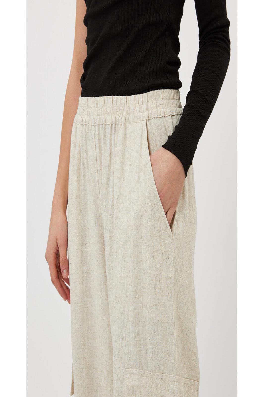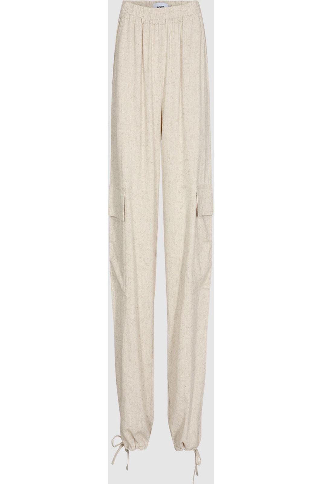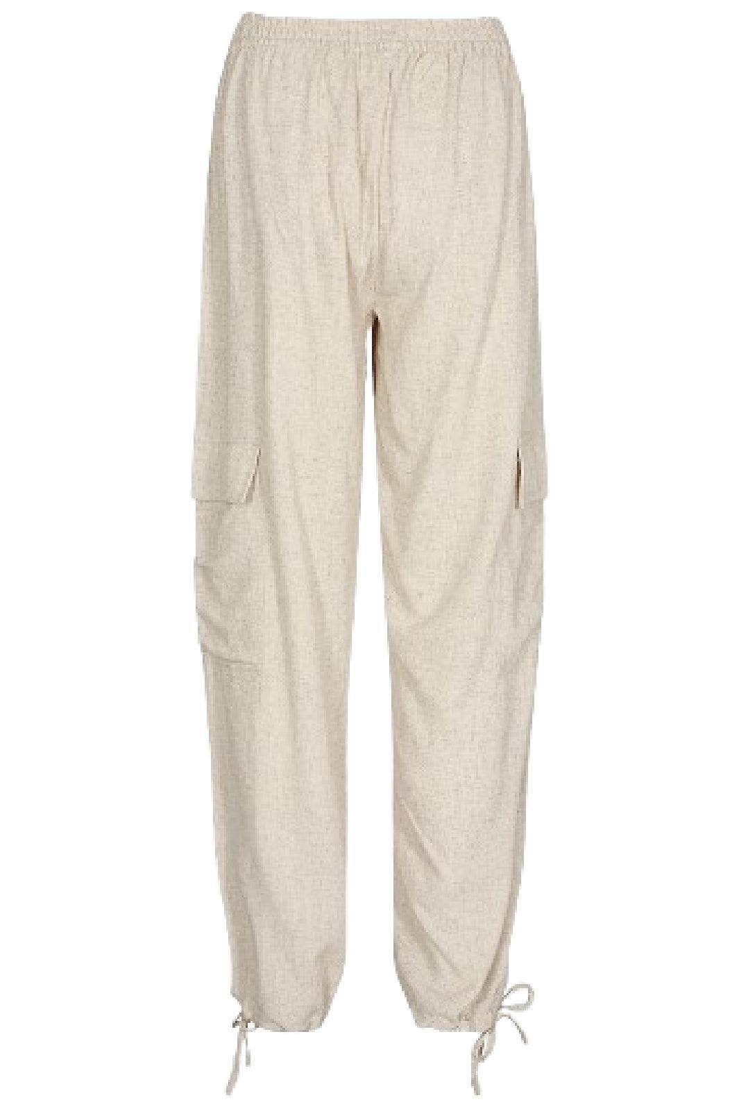 Cargo-housut Movesilta hiekanvärisestä viskoosista ja pellavasta. Housuissa on löysä malli, joustava vyötärö ja naru, käytännölliset cargo-taskut ja narudetaljit nilkoissa.