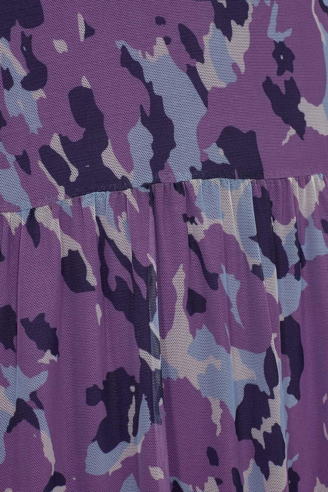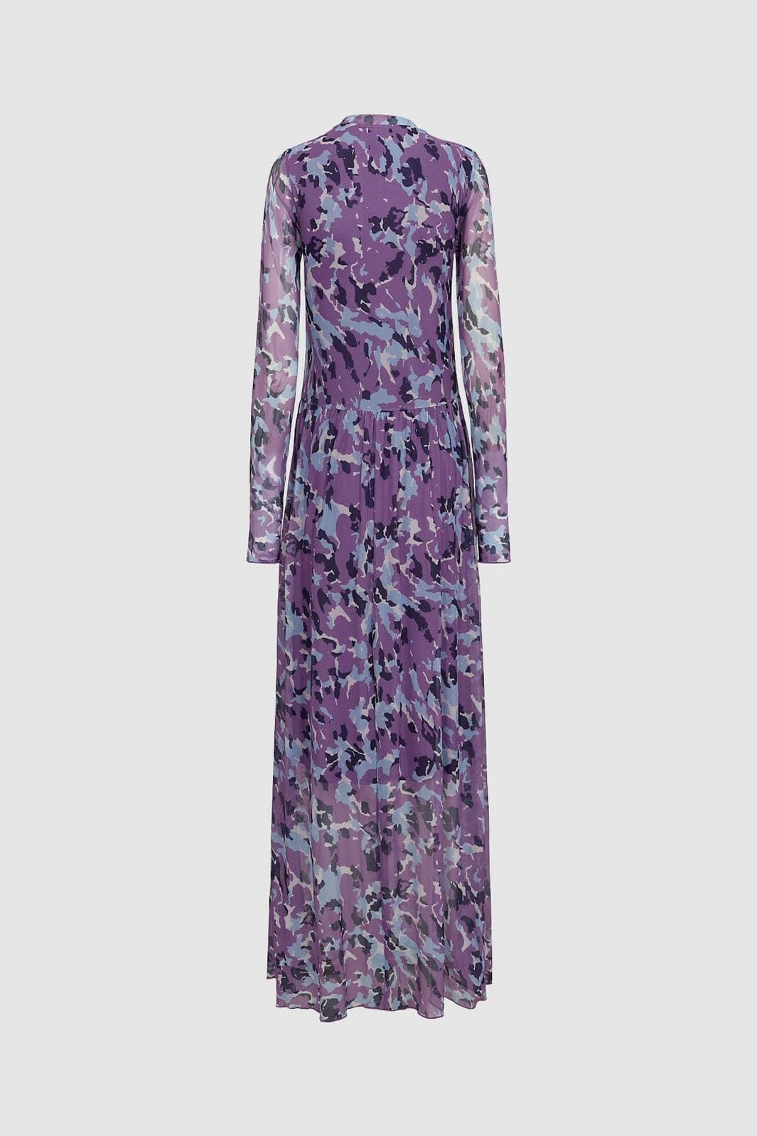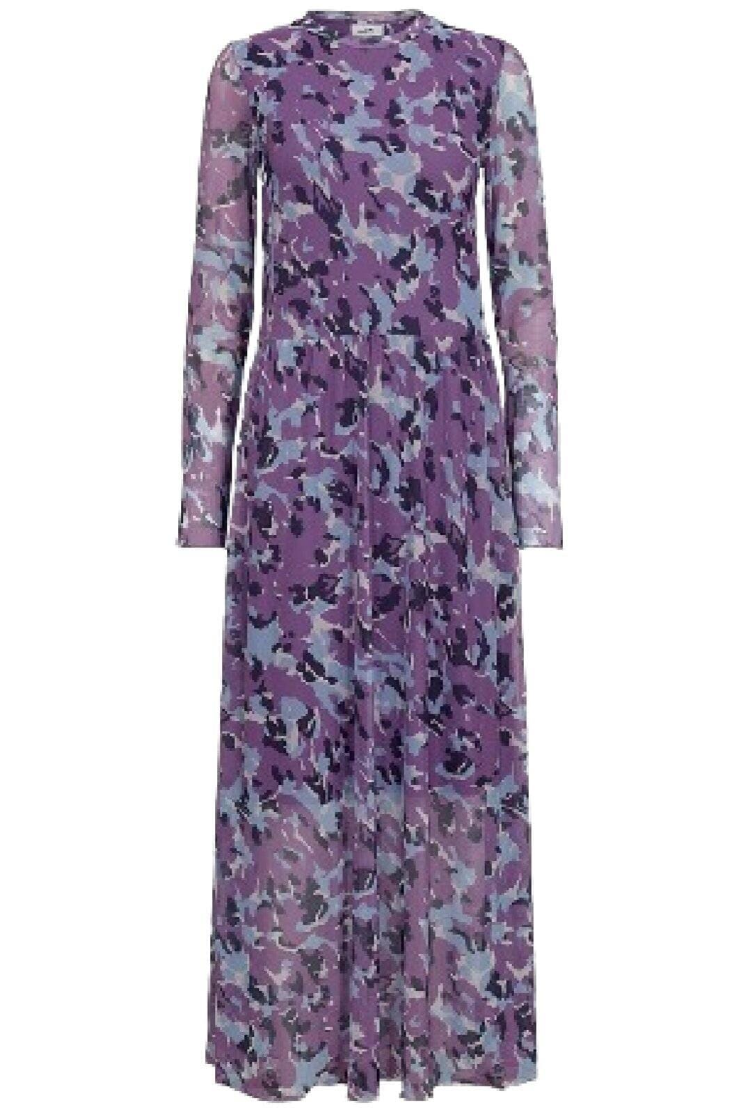 Pitkähihaista mekkoa Moves By Minimumilta violetin sävyissä, jossa on abstrakti kuvio. Mekossa on löysä malli ja korkea kaulus, jossa on röyhelöyksityiskohtia.
