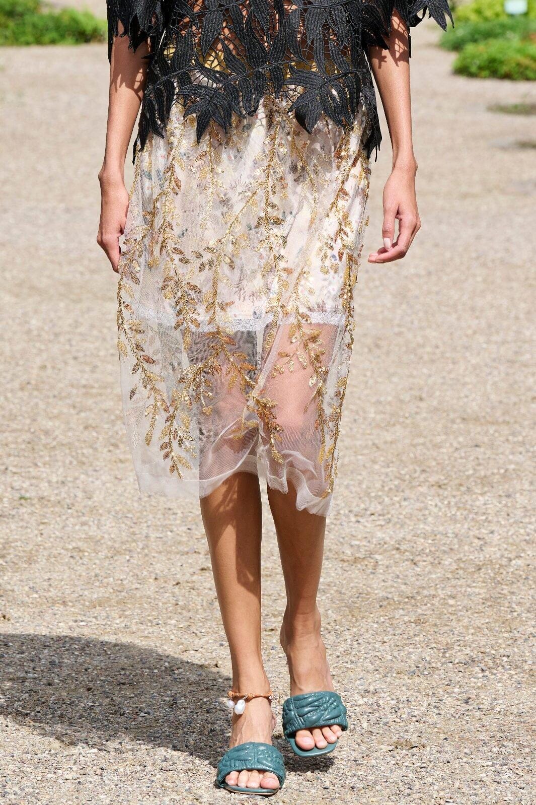 Läpinäkyvä Munthe-hame, jossa on kultainen lehtikirjailu. Hame on valmistettu kevyestä, läpinäkyvästä materiaalista, jossa on yksityiskohtainen kirjailu kullan sävyissä lehtiaiheilla.