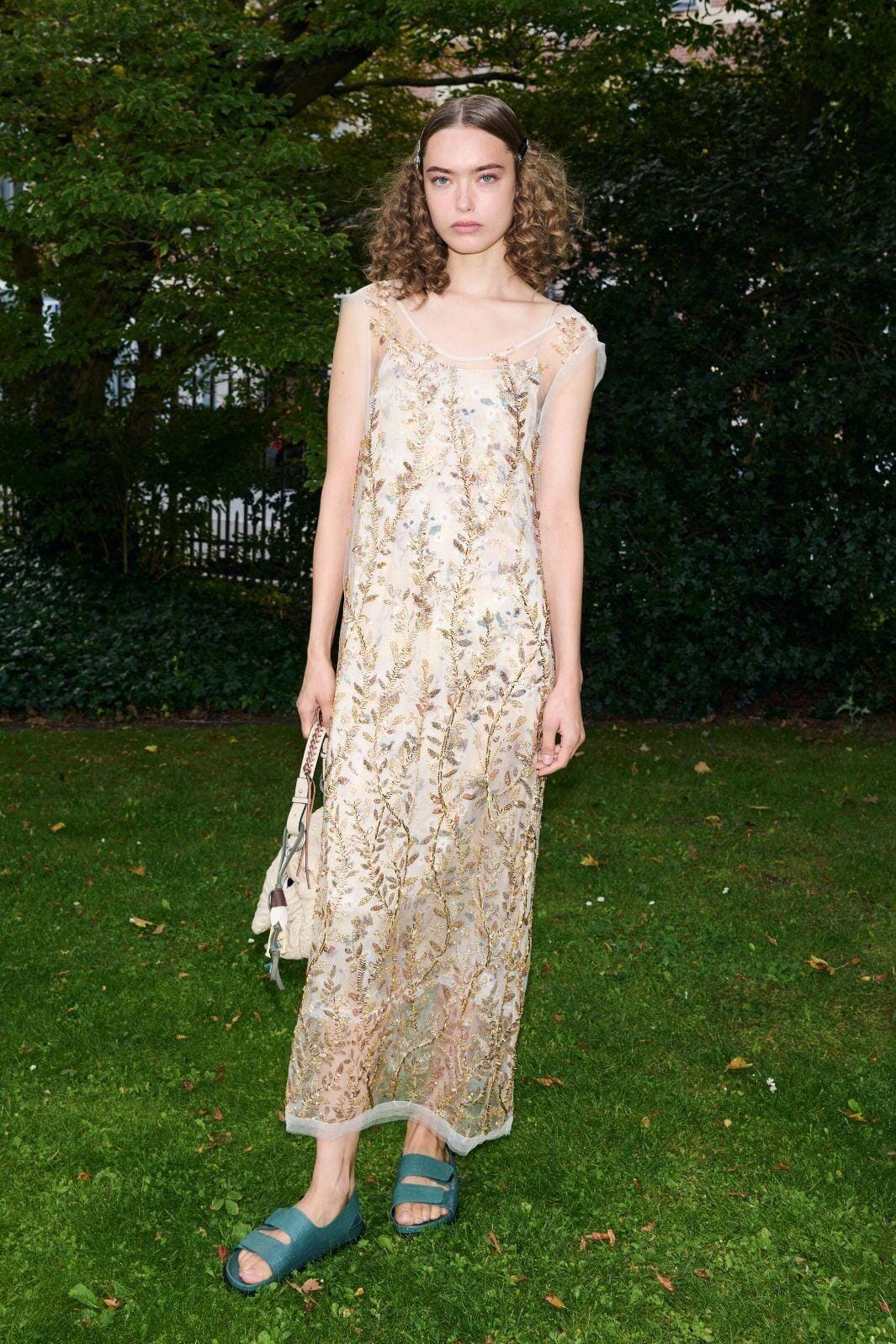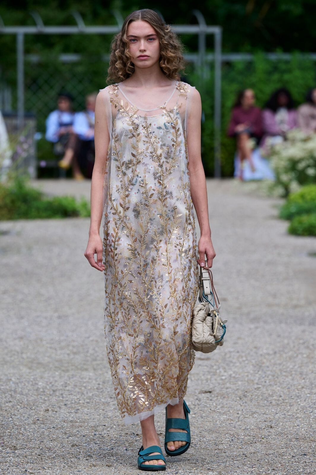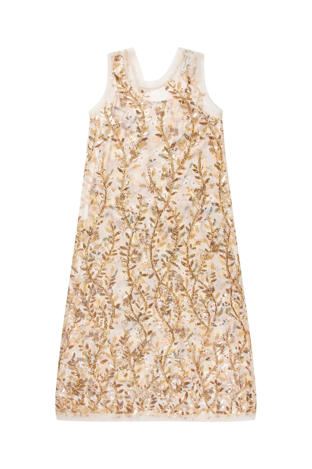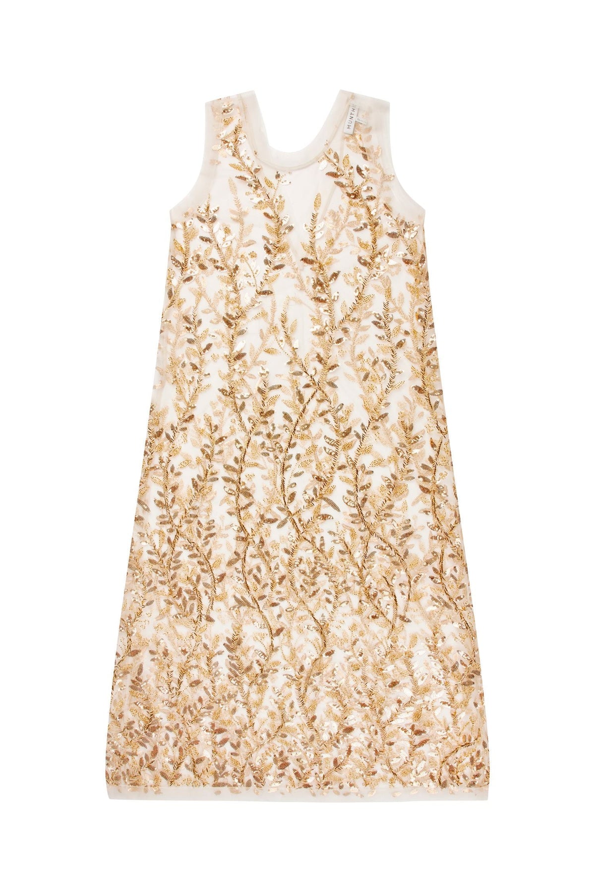 Munthen kultainen mekko, jossa on kukkakuvio, joka on luotu kirjailuilla, paljeteilla ja helmiyksityiskohdilla, järjestettynä lehtimäiseen kuvioon puoliläpinäkyvälle kankaalle.