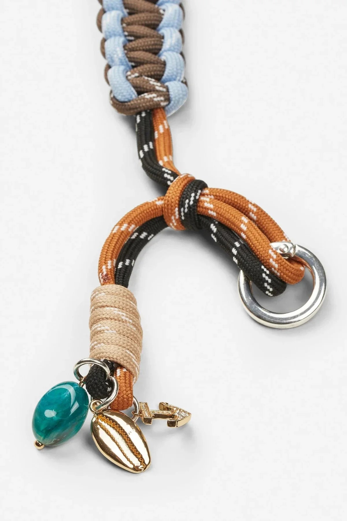 Munthen laukunhihna on valmistettu punotusta köydestä sinisen ja ruskean sävyissä. Hihna on irrotettava ja sen päissä on koristeelliset riipukset.