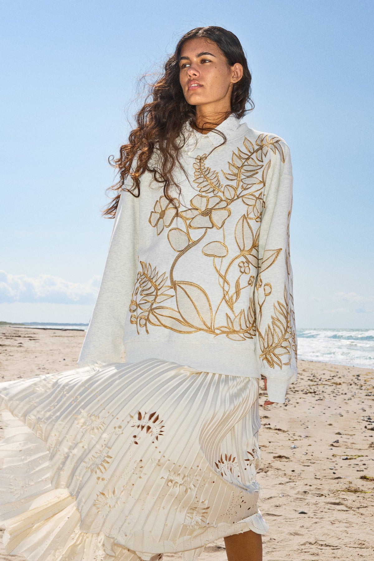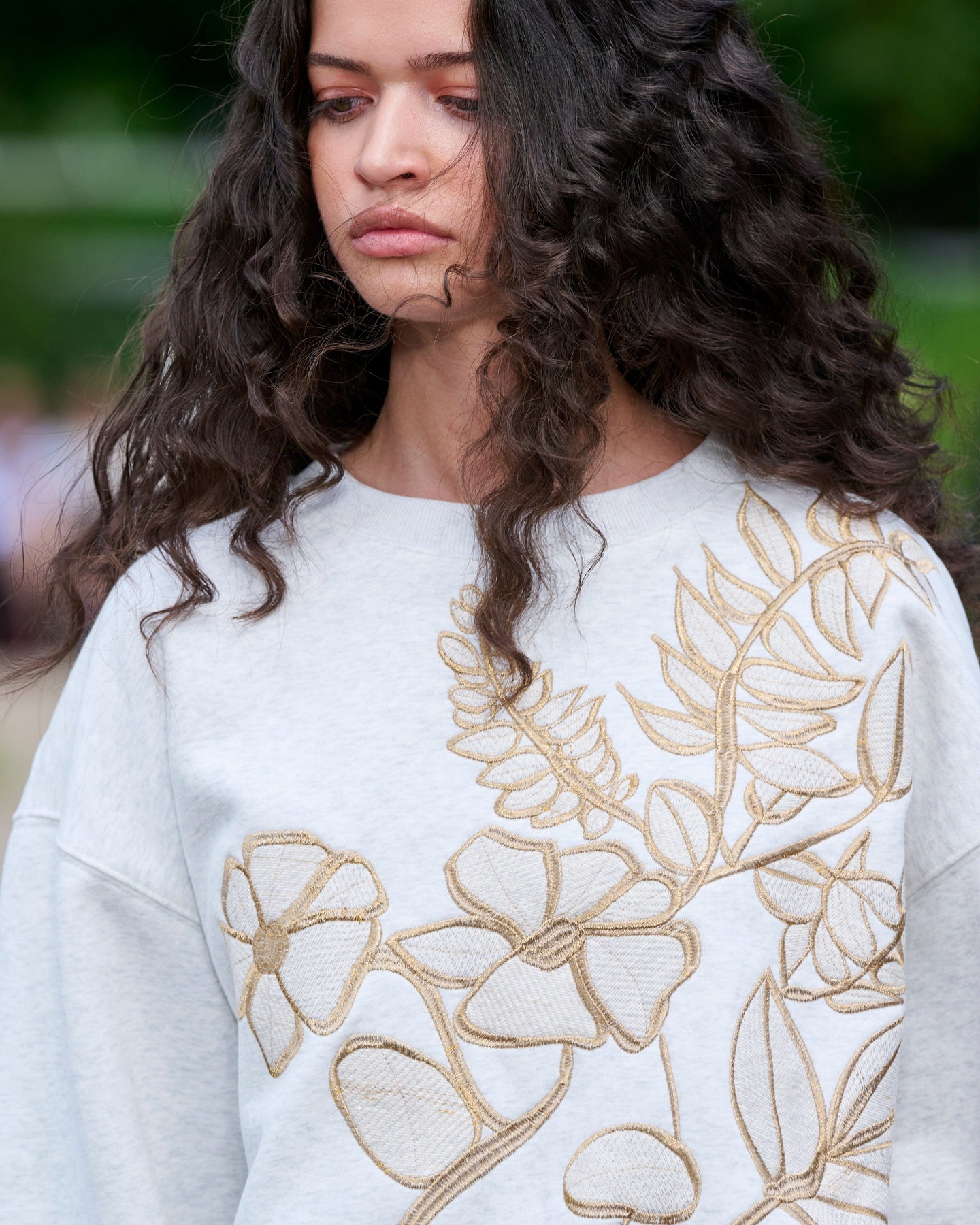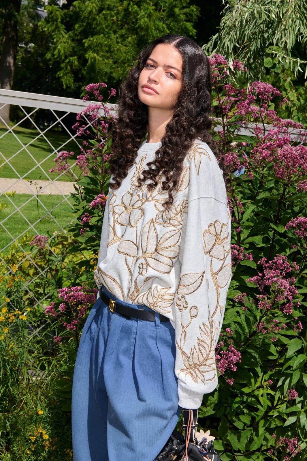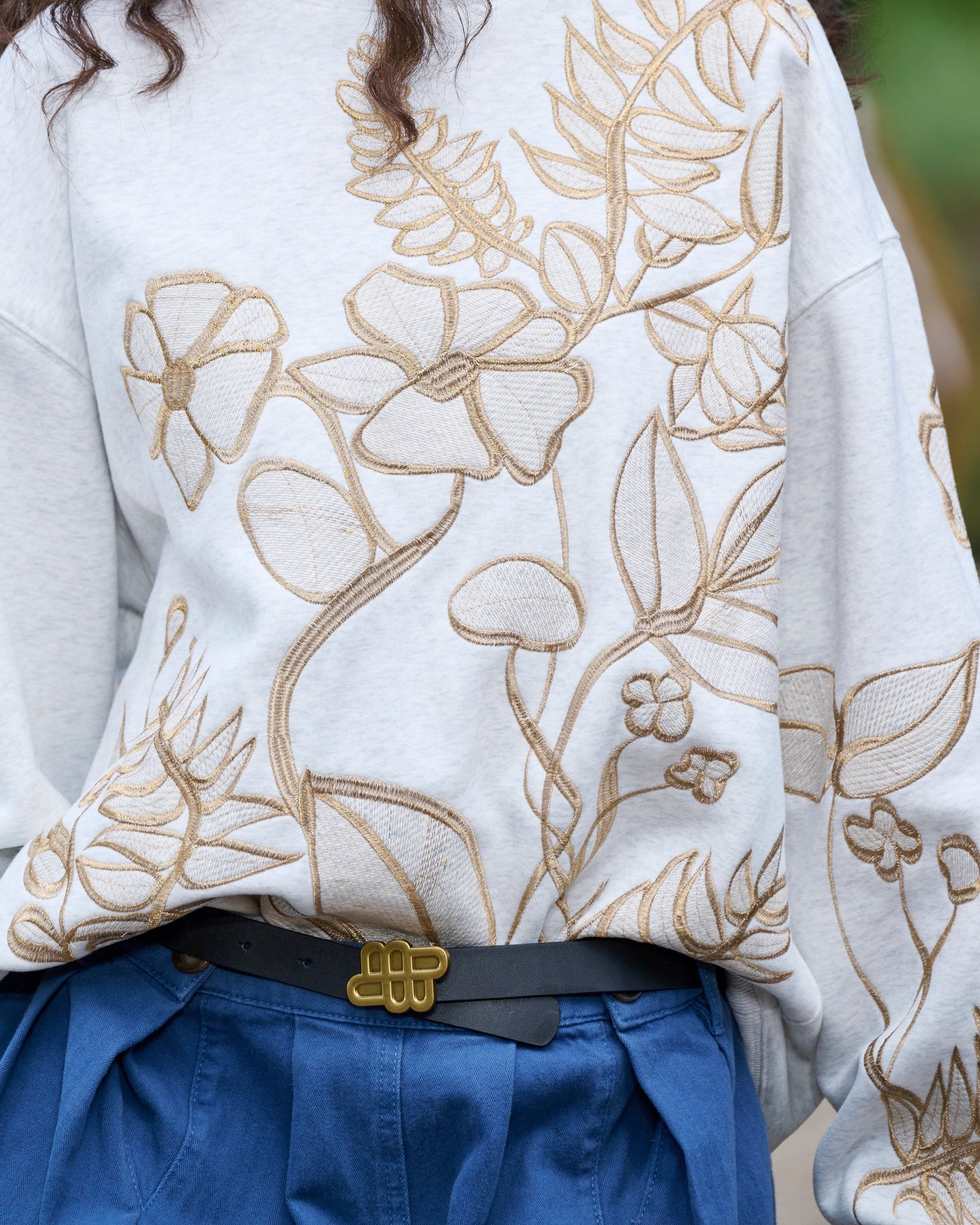 Vaaleanharmaa Munthe-collegepaita, jossa on kukkakirjailu kultasävyissä edessä ja hihoissa. Väljä oversize-istuvuus, pyöreä pääntie ja pitkät hihat.