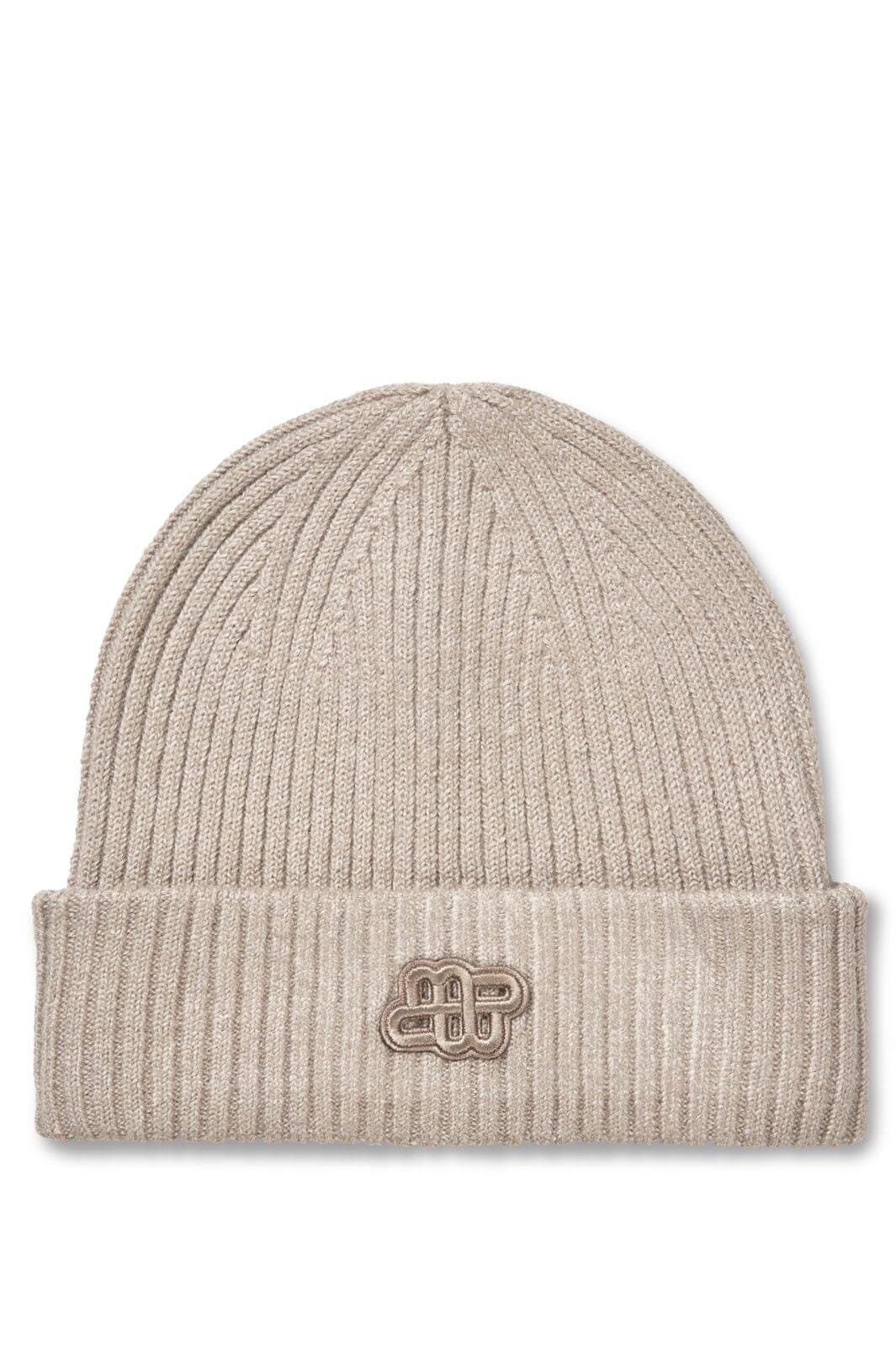 Beige pipo Muntheltä, jossa on ribbikuvio. Pipossa on käännetty reuna ja brodeerattu logo edessä. Se on valmistettu pehmeästä kierrätetyn polyesterin sekoituksesta.