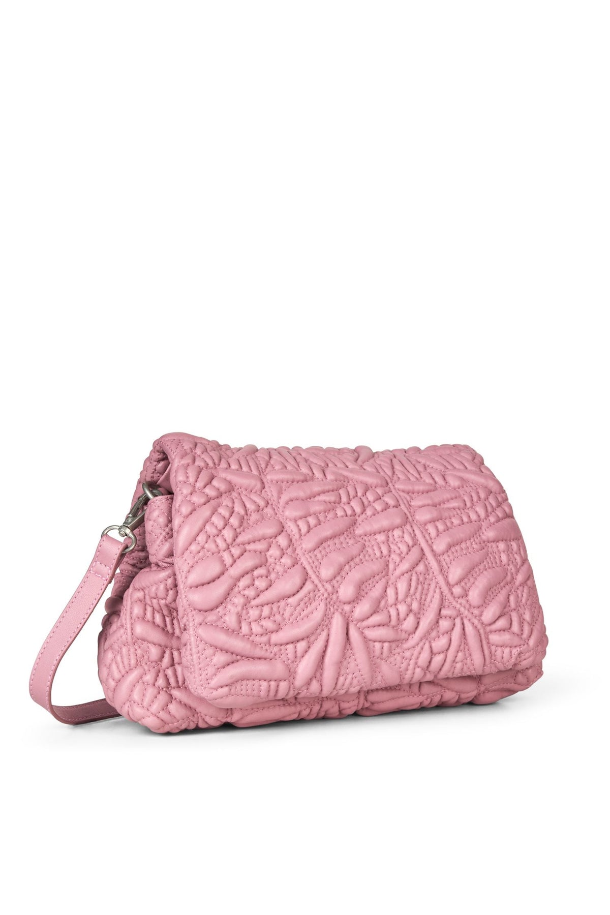Vaaleanpunainen olkalaukku Munthelta, valmistettu pehmeästä lampaannahasta, jossa on tikattu kukkakuvio. Laukussa on magneettisuljin ja säädettävä olkahihna.