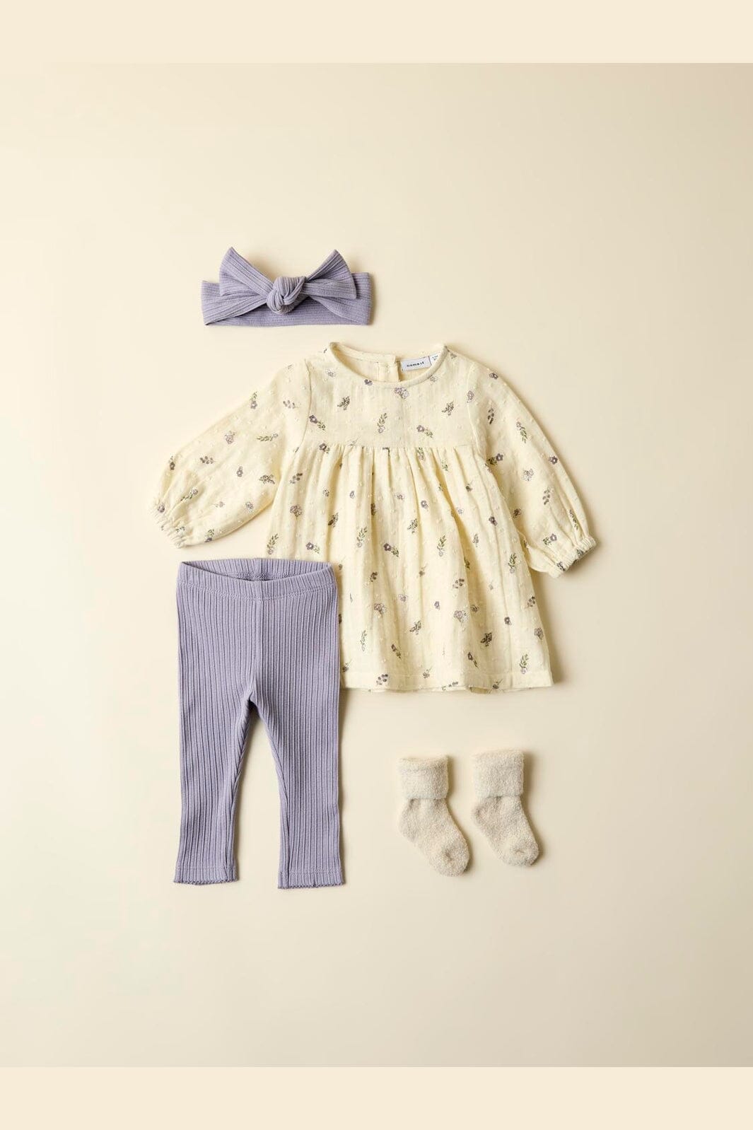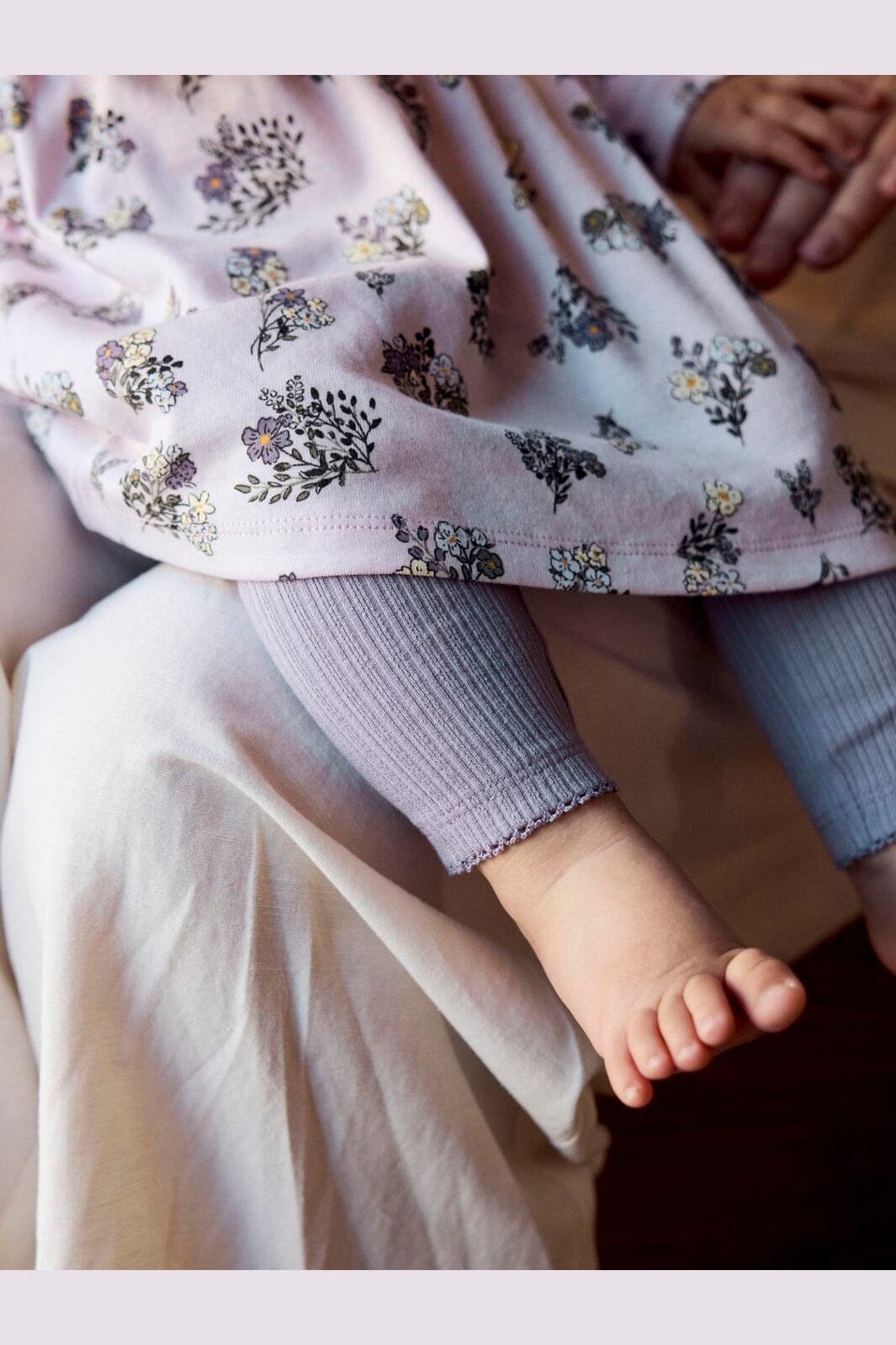 Name It -leggingsit vaalean laventelinharmassa sävyssä. Valmistettu pehmeästä, luomupuuvillasta, jossa on elastaania joustavuuden vuoksi.