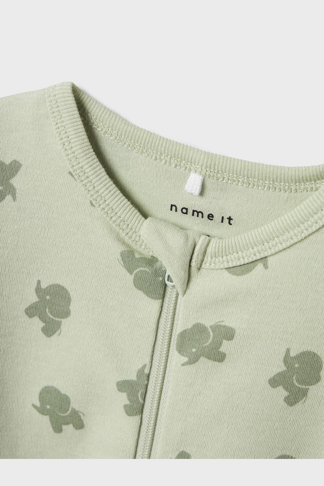 Name It -yöhaalari vaaleanvihreässä värissä, jossa on norsukuosi. Haalarissa on vetoketju kaulasta lahkeeseen ja se on valmistettu luomupuuvillan ja tavallisen puuvillan sekoituksesta.