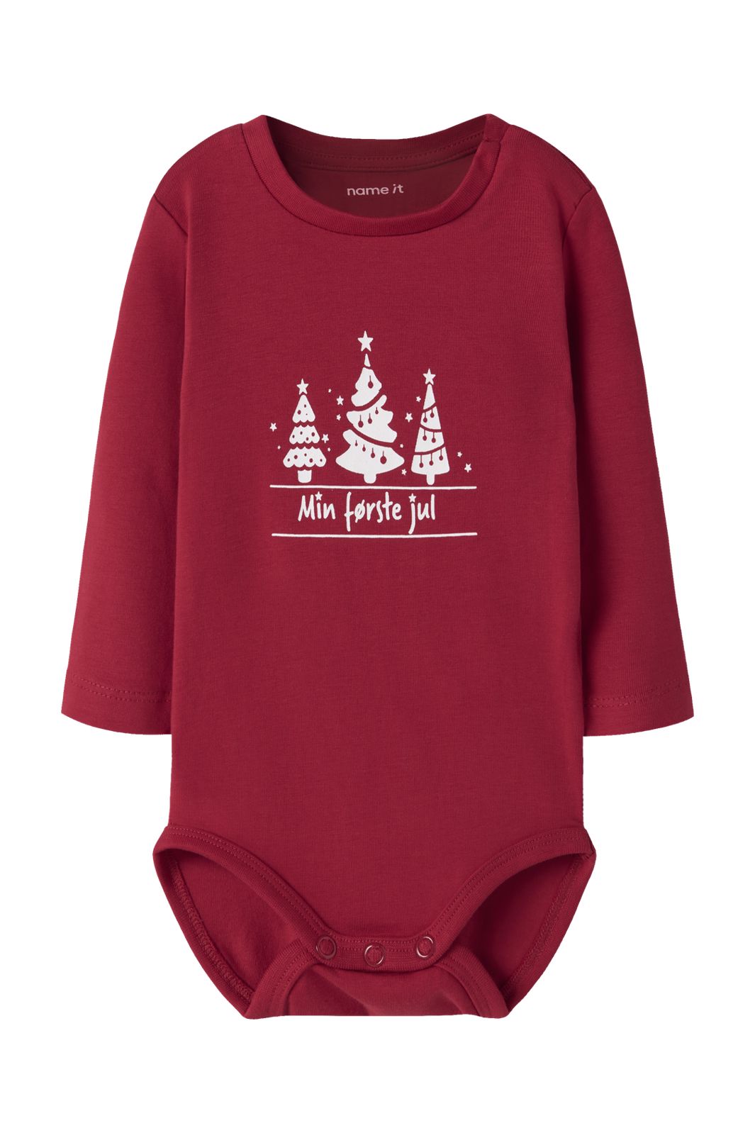 Punainen body Name Itiltä pehmeästä jersey-kankaasta joulukuusimotiivilla ja tekstillä Ensimmäinen jouluni. Bodyn hihat ovat pitkät ja olkapäällä on napit, jotka helpottavat pukemista ja riisumista.
