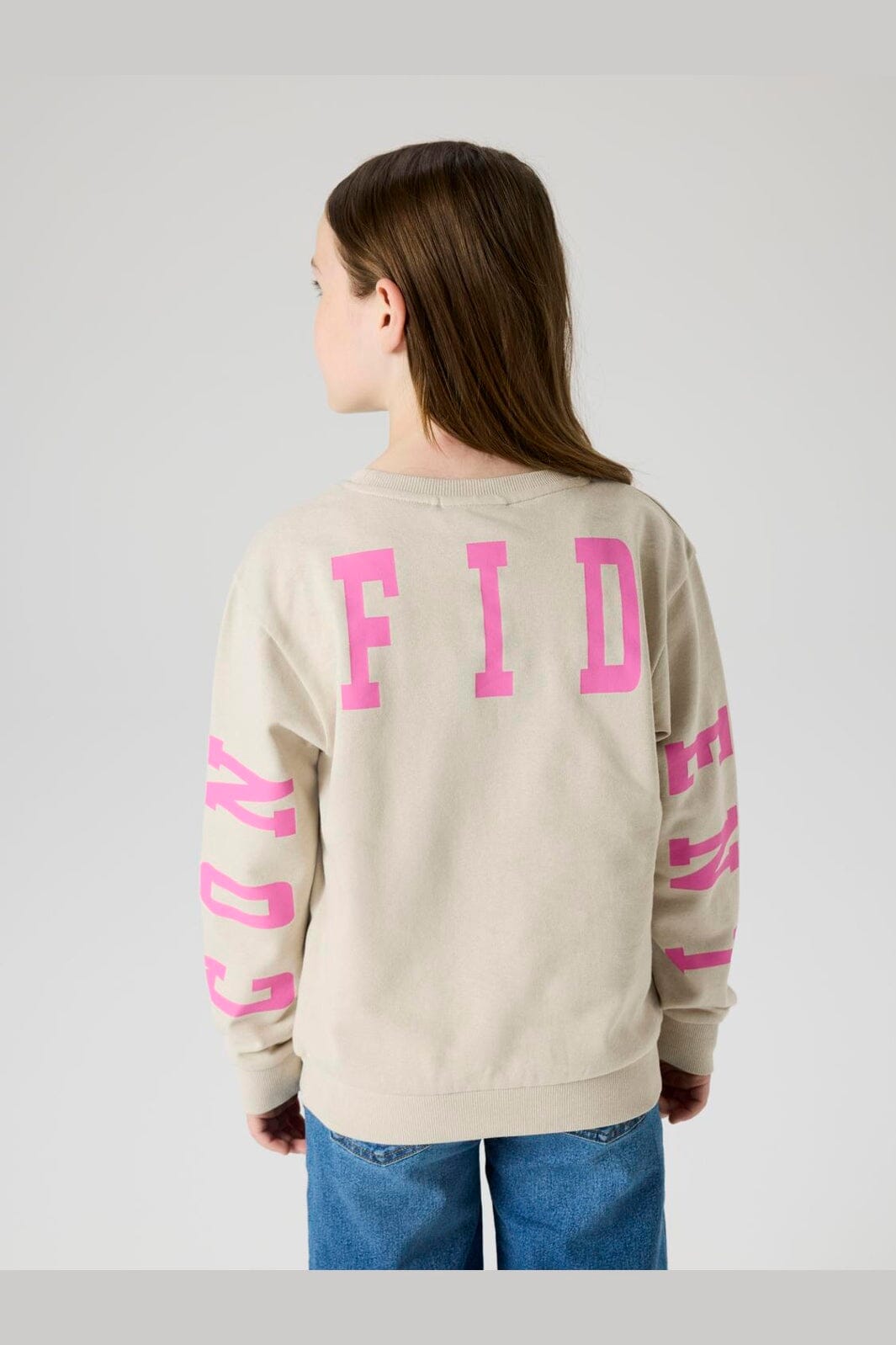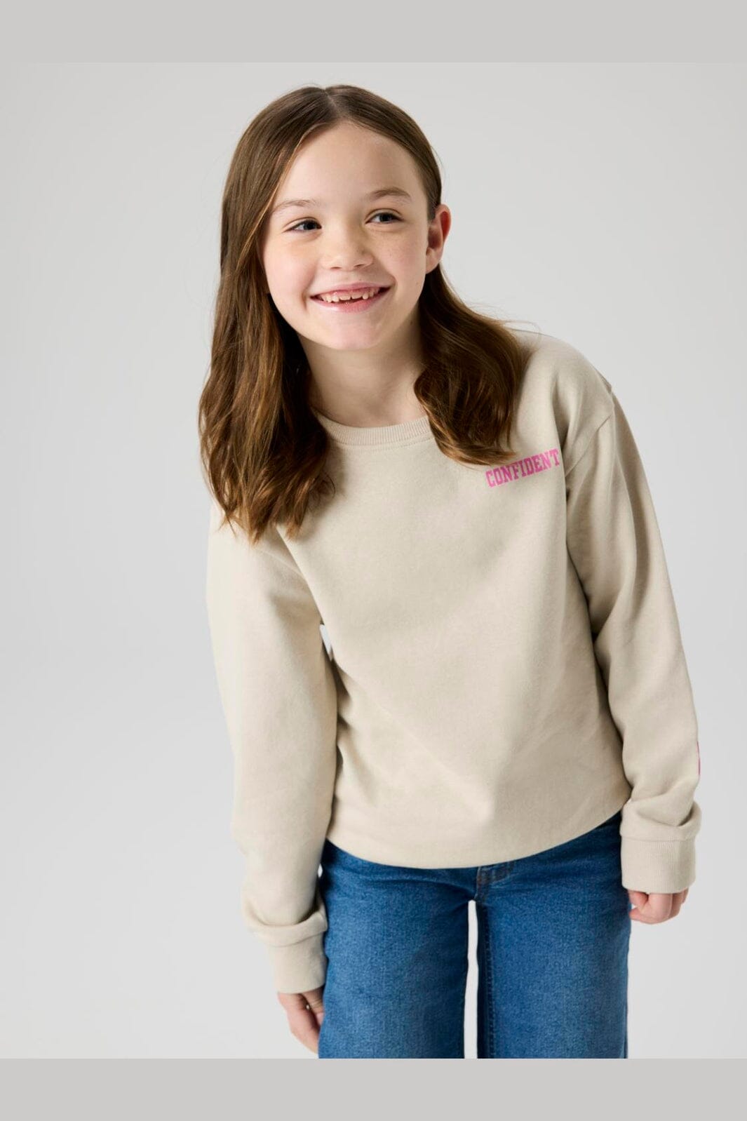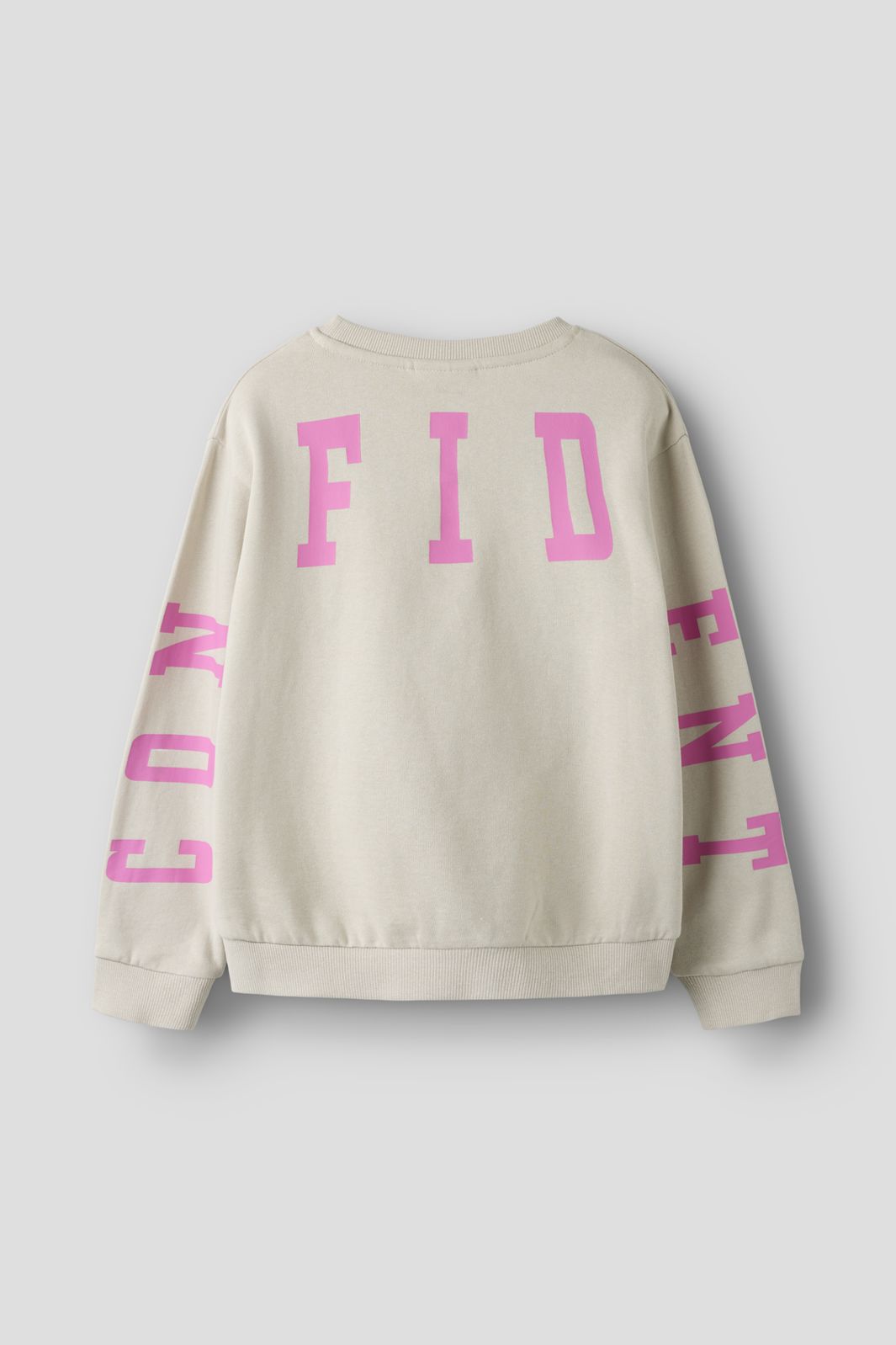 Name It -collegepaita vaaleanharmaana, vaaleanpunaisella CONFIDENT-painatuksella edessä ja takana. Collegepaidassa on pyöreä pääntie ja resorit hihansuissa.