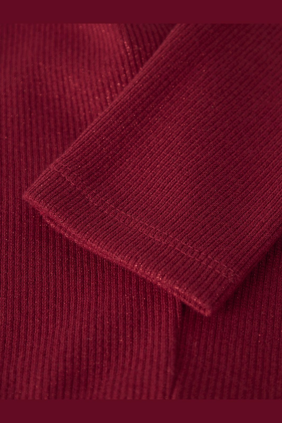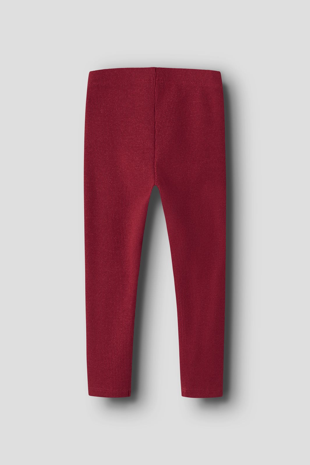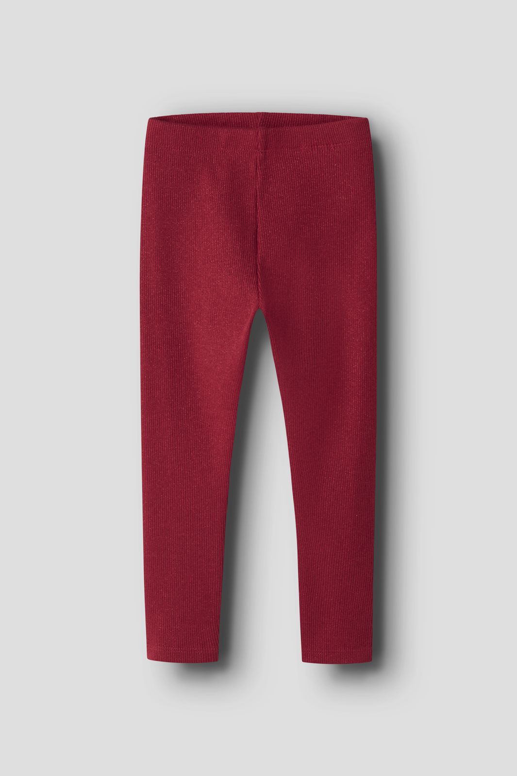 Punaiset leggingsit Name Itiltä, joissa on ribattu rakenne. Valmistettu pehmeästä puuvillasekoituksesta, jossa on metallikuituja, jotka antavat kevyen kiiltävän ilmeen. Joustava vyötärö takaa hyvän liikkuvuuden.