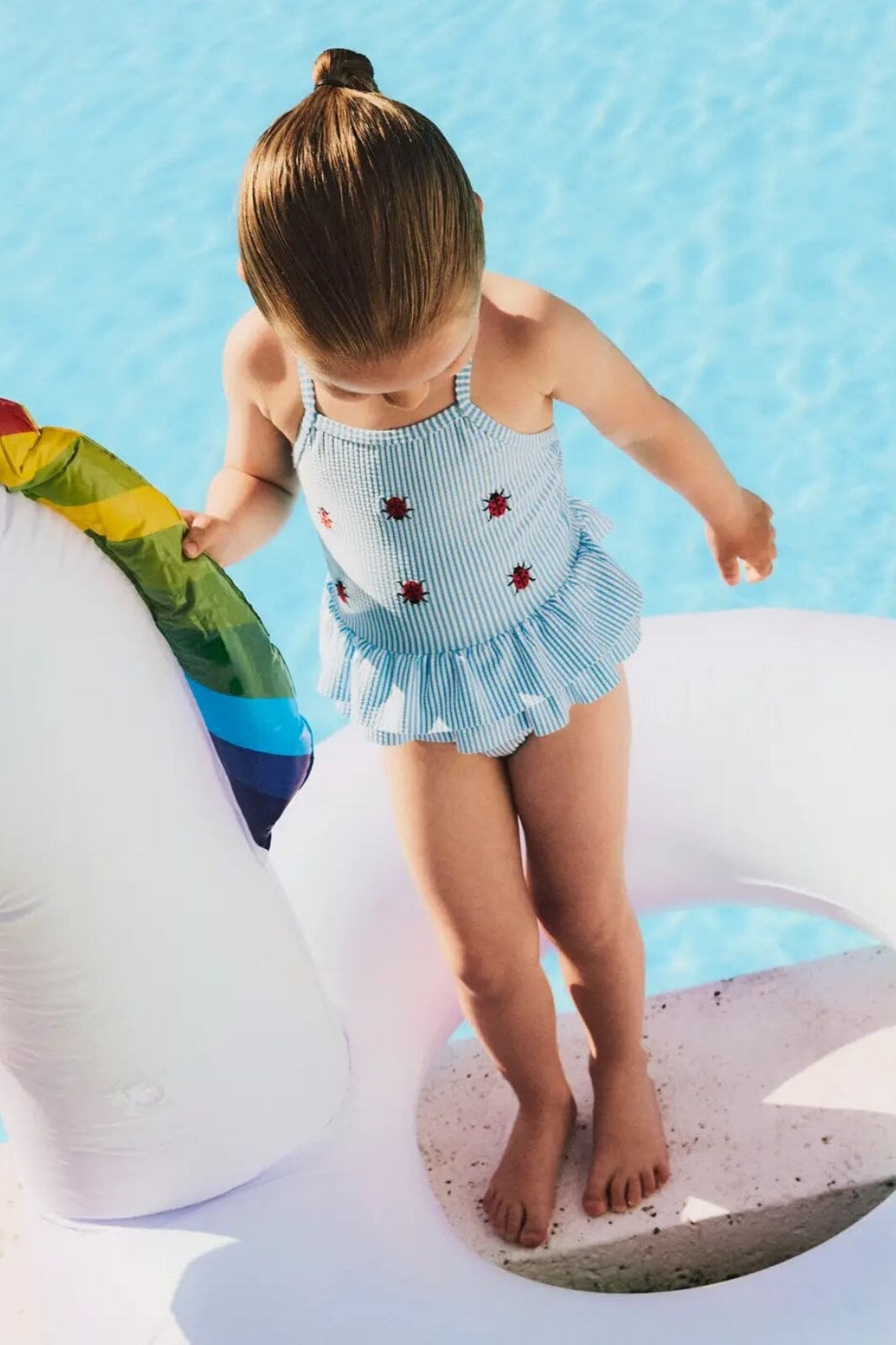 Vaaleansininen uimapuku Name Itiltä, jossa on valkoisia raitoja ja brodeerattuja leppäkerttuja. Uimapuvussa on ristikkäiset olkaimet selässä ja röyhelöitä vyötäröllä.