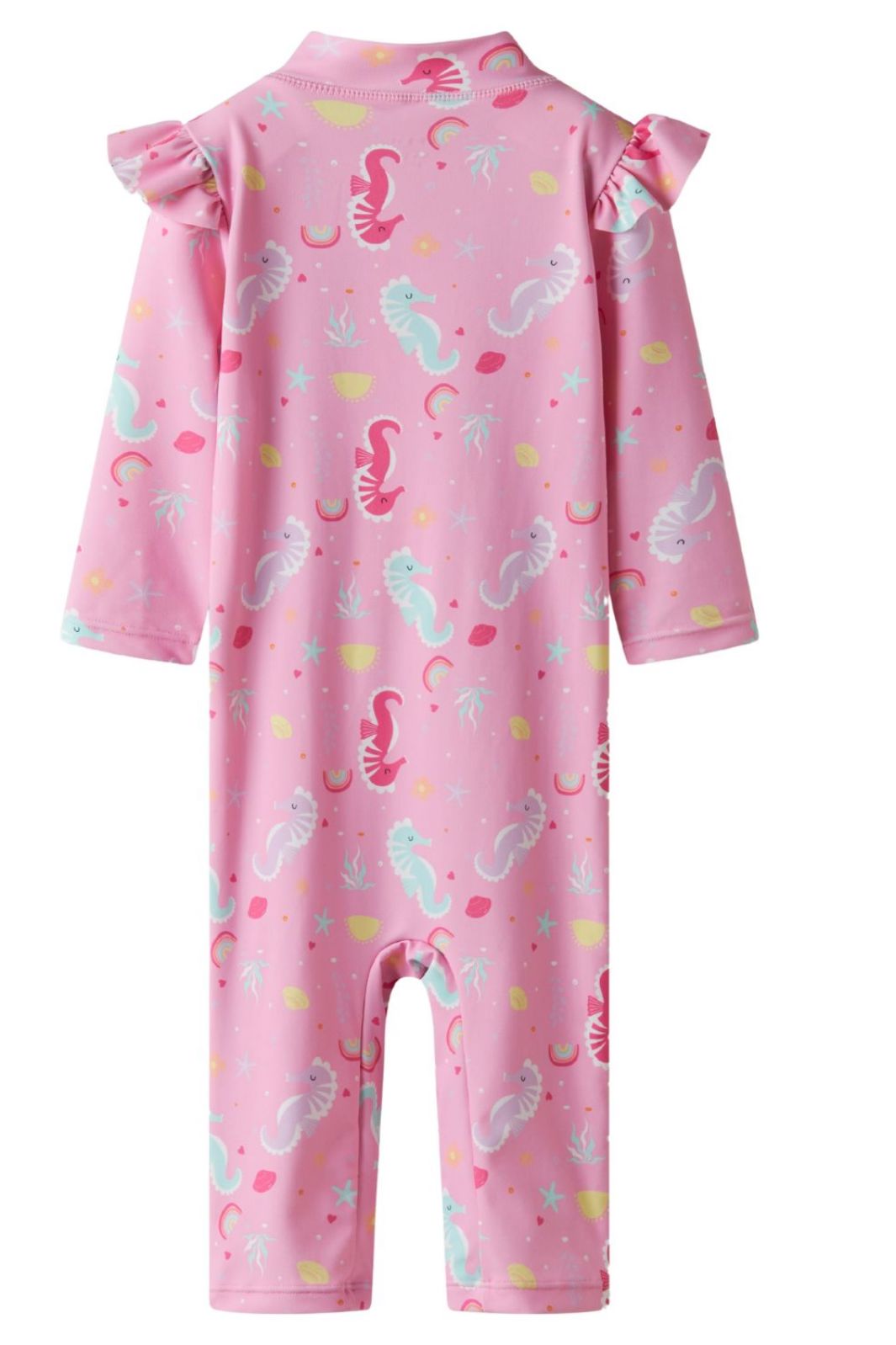 Vaaleanpunainen UV-uimapuku Name Itiltä, jossa on merihevos- ja tähtiprintti. 3/4-pituiset hihat ja UPF 50+ suojaavat UVA- ja UVB-säteiltä leikin aikana vedessä.